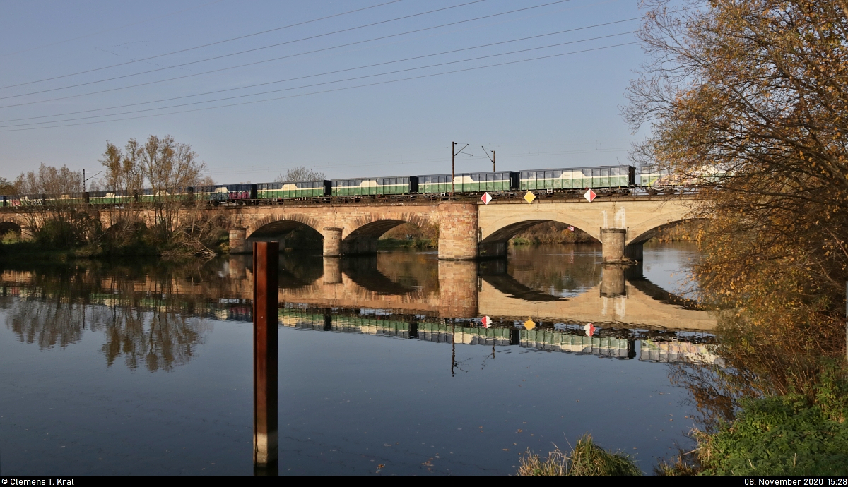 Eine lange Schlange aus in Bulgarien registrierten offenen Güterwagen der Gattung "Eaos" bahnt sich ihren Weg auf der Saalebrücke in Halle-Wörmlitz Richtung Halle Rosengarten. Zuglok ist E 37 530 (91 87 0 037530-0 F-AKIEM | Alstom Prima EL3U/4).