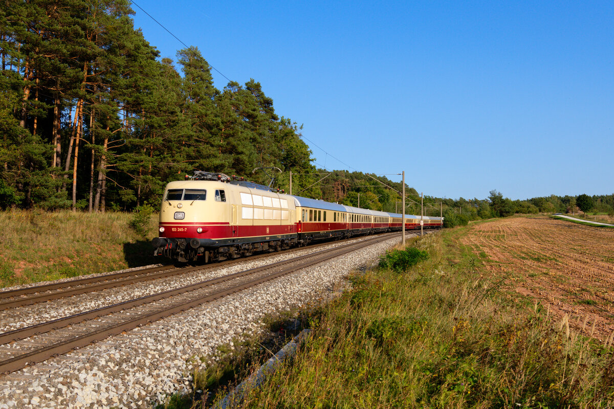 IRSI/IGE Re 4/4 11387 (Re 421 387-2) mit dem DPE 31396 (Basel SBB - Neustrelitz) am Morgen des 04.07.2020 zwischen Schliengen uun Auggen im Rheintal. Tobias Schmidt