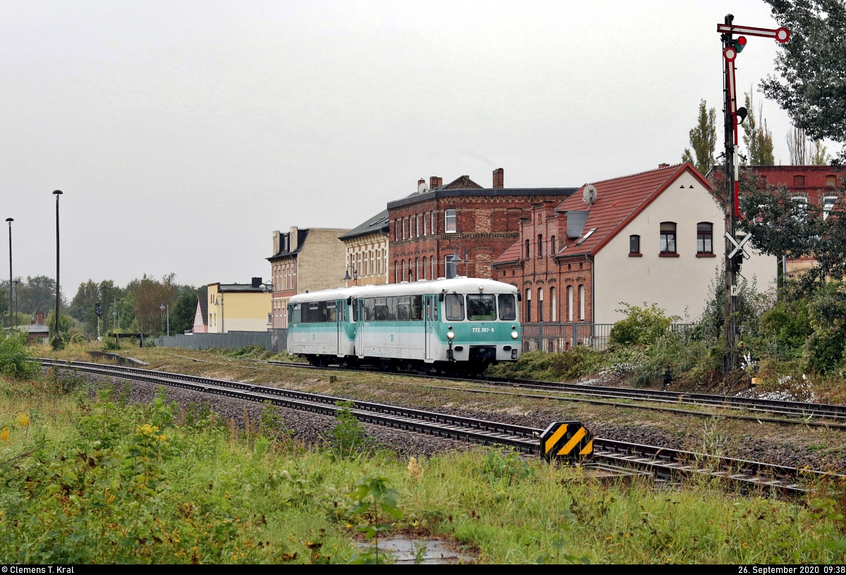Nachschuss auf 772 312-5 (771 012-2 | 171 012-2 | VT 2.09.067 | 95 80 0772 006-2 D-BSV) und 772 367-9 (771 067-6 | 171 067-2 | VT 2.09.067 | 95 80 0772 007-0 D-BSV) in Staßfurt, Industriestraße. Es handelt sich um den Pendelverkehr zum diesjährigen Herbstlokfest des Lokschuppens Staßfurt zwischen Staßfurt-Leopoldshall und dem Bahnhof Staßfurt.