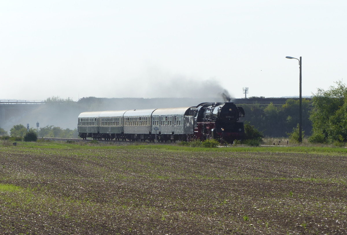 Anlässlich des Herbstlokfests des Lokschuppens Staßfurt wurden am Samstag zwei Rundfahrten von und nach Staßfurt über Aschersleben, Halberstadt, Magdeburg Hbf und Schönebeck(Elbe) angeboten. Zum Auftakt des (leider völlig verregneten) Tages konnte die Frührunde an der Bahnhofstraße in Giersleben festgehalten werden. Es führt 41 1144-9 (41 144); an ihrem Haken hängen drei verschiedene Wagentypen.