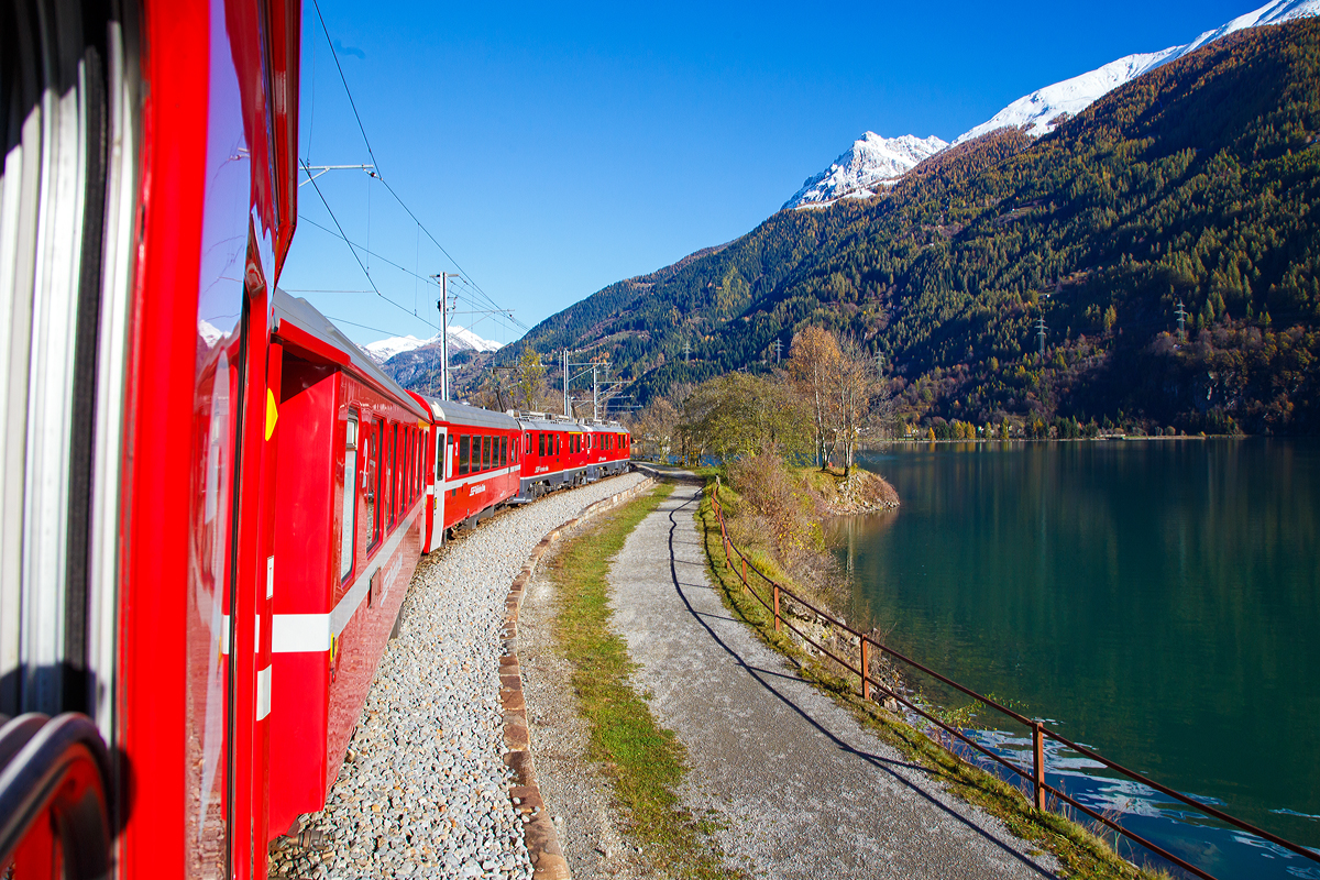 Geführt von den beiden RhB ABe 4/4 III Triebwagen, Nr. 53 "Tirano" und Nr. 54 "Hakone", fährt unser RhB Regionalzug von Tirano nach St. Moritz, am Lago di Poschiavo entlang. Armin Schwarz