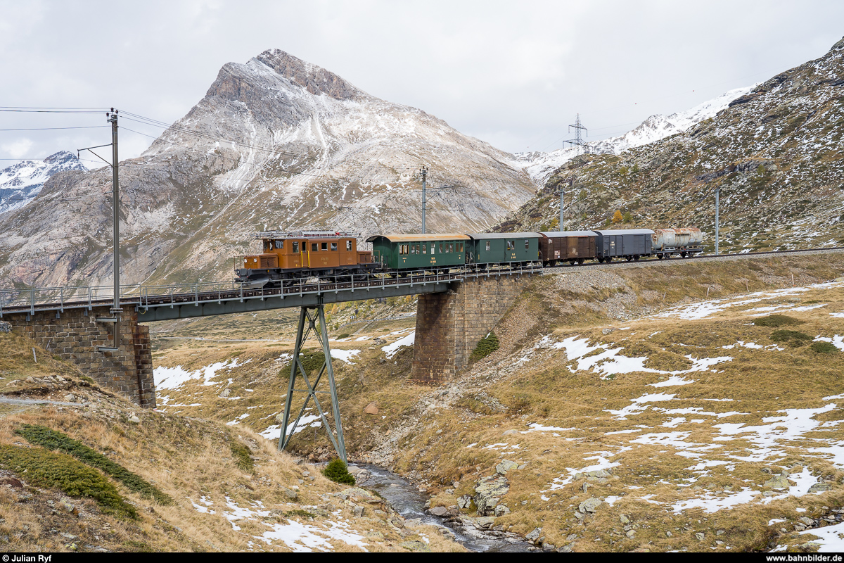 RhB Gem 4/4 802 "Murmeltier" ist am 20.10.2020 mit einem Bauzug am Bernina unterwegs. Hier auf der bekannten Brücke zwischen Ospizio Bernina und Lagalp aufgenommen. Yannik Gartmann