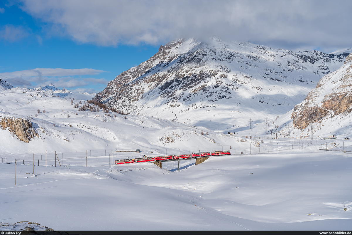 Der Fotozug auf der "Wildwest-Brücke" zwischen Ospizio Bernina und Bernina Lagalb. Julian Ryf