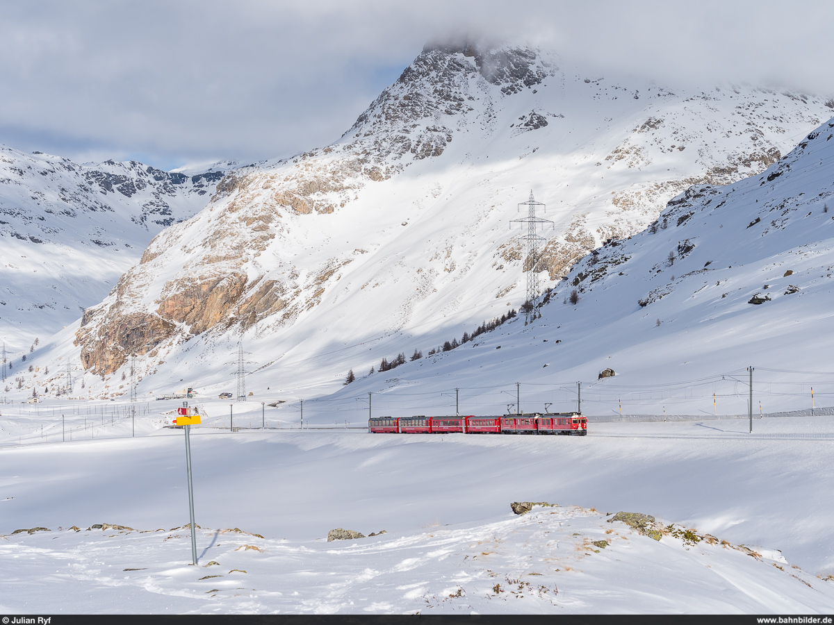 Geführt von dem ALLEGRA-Zweispannungstriebzug RhB ABe 8/12 – 3501 „Willem Jan Holsboer „ erreicht am 04.11.2019 unser RhB Regionalzug von Tirano nach St. Moritz, bald den höchten Punkt der Berninabahn, Ospizio Bernina. Links der Lago Bianco (wobei „weiß" ist er bei dem Wetter nicht).
