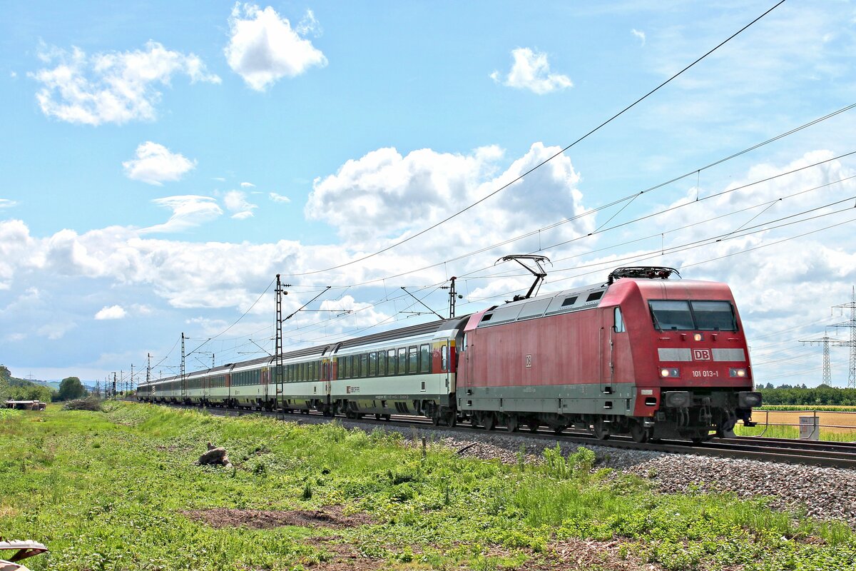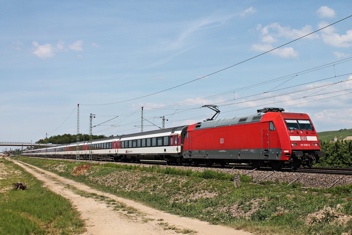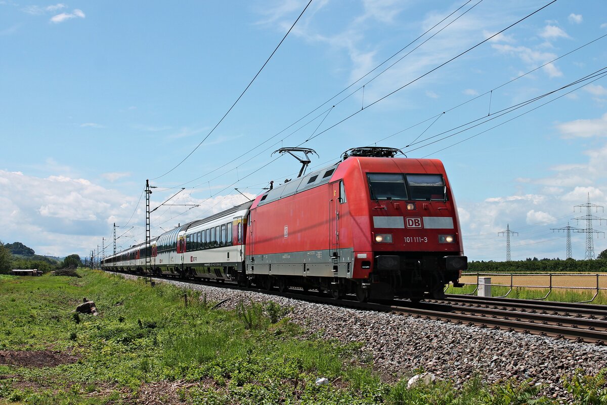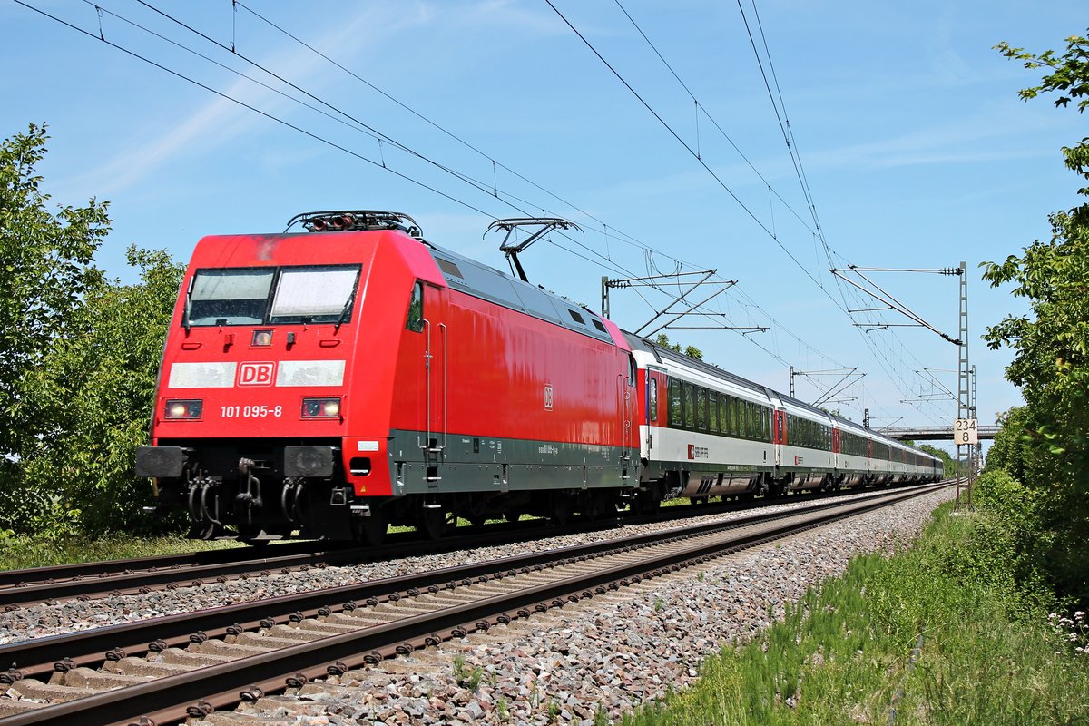 Am späten Mittag des 27.05.2020 fuhr 101 095-8 mit dem EC 7 (Hamburg Altona - Interlaken Ost) bei Hügelheim über die Rheintalbahn durchs Markgräflerland in Richtung Schweiz. Tobias Schmidt
