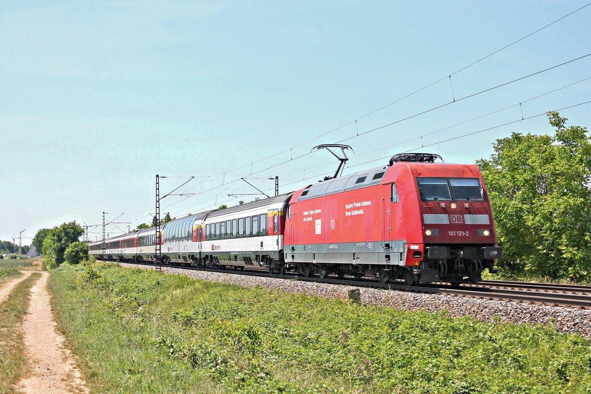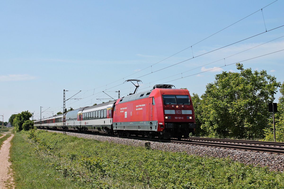 Am Mittag des 02.06.2020 fuhr 101 121-2 mit dem EC 8 (Zürich HB - Hamburg Altona) nördlich von Müllheim (Baden) bei Hügelheim über die Rheintalbahn in Richtung Buggingen. Tobias Schmidt