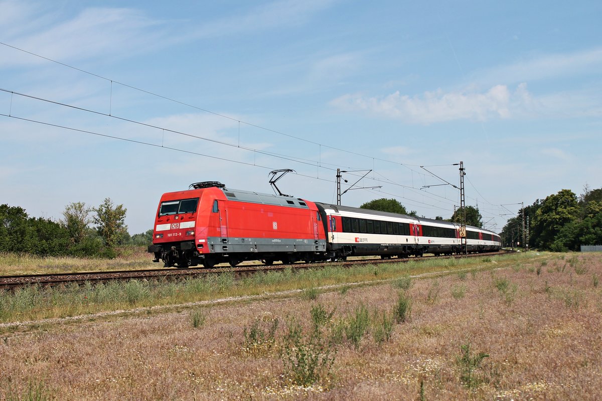 Mit dem EC 7 (Hamburg Altona - Interlaken Ost) fuhr am Vormittag des 03.06.2020 die 101 113-9 zwischen Neulußheim und Waghäusel über die Rheintalbahn in Richtung Graben-Neudorf/Karlsruhe Hbf. Tobias Schmidt
