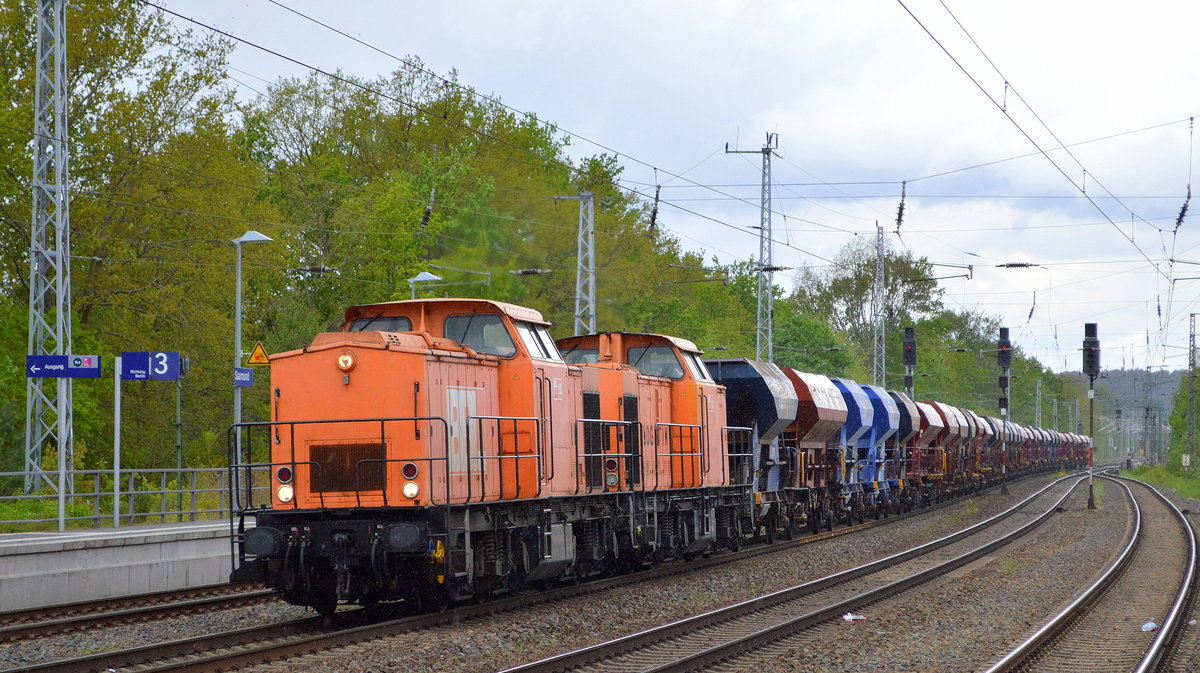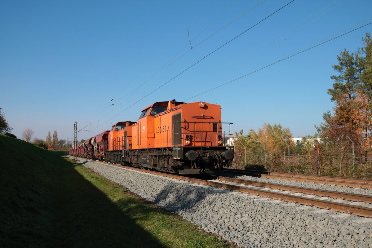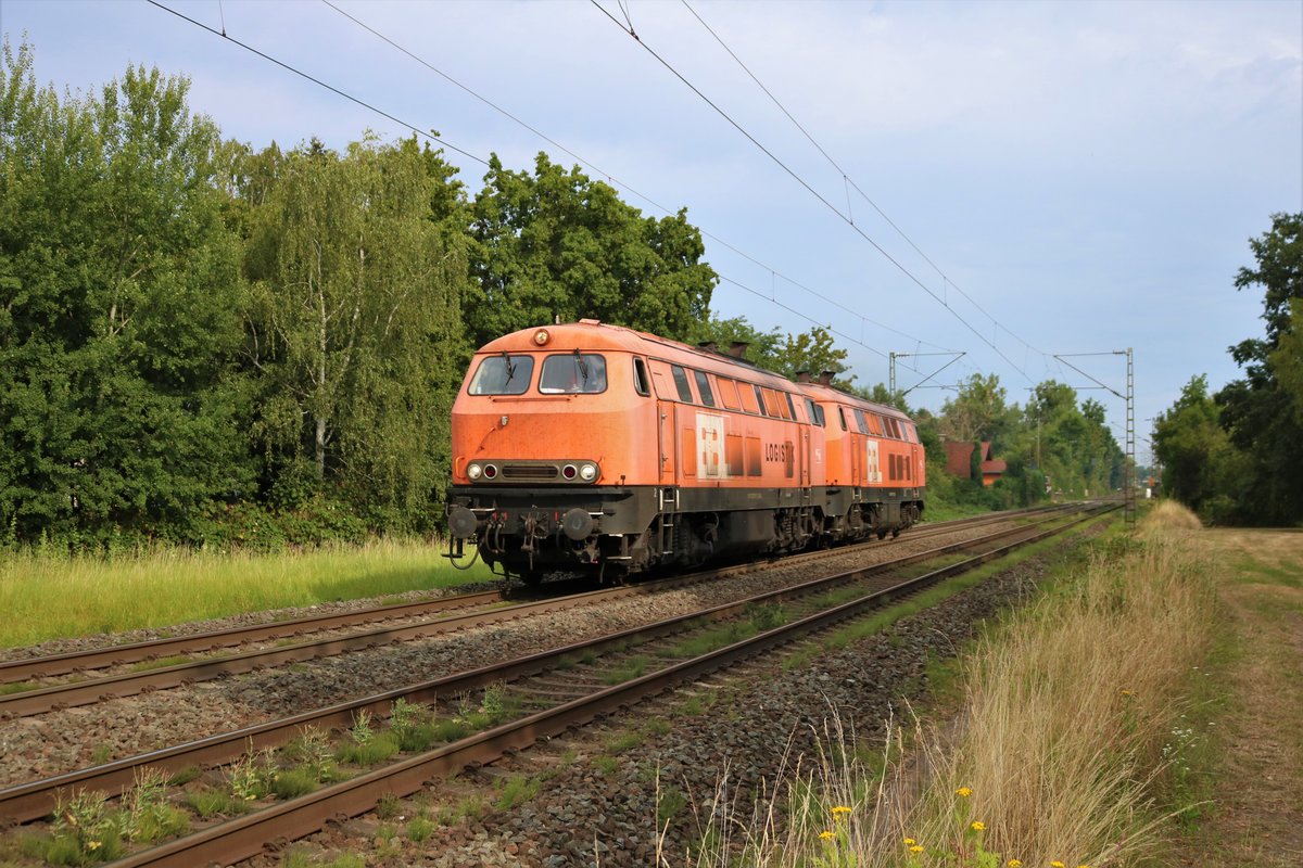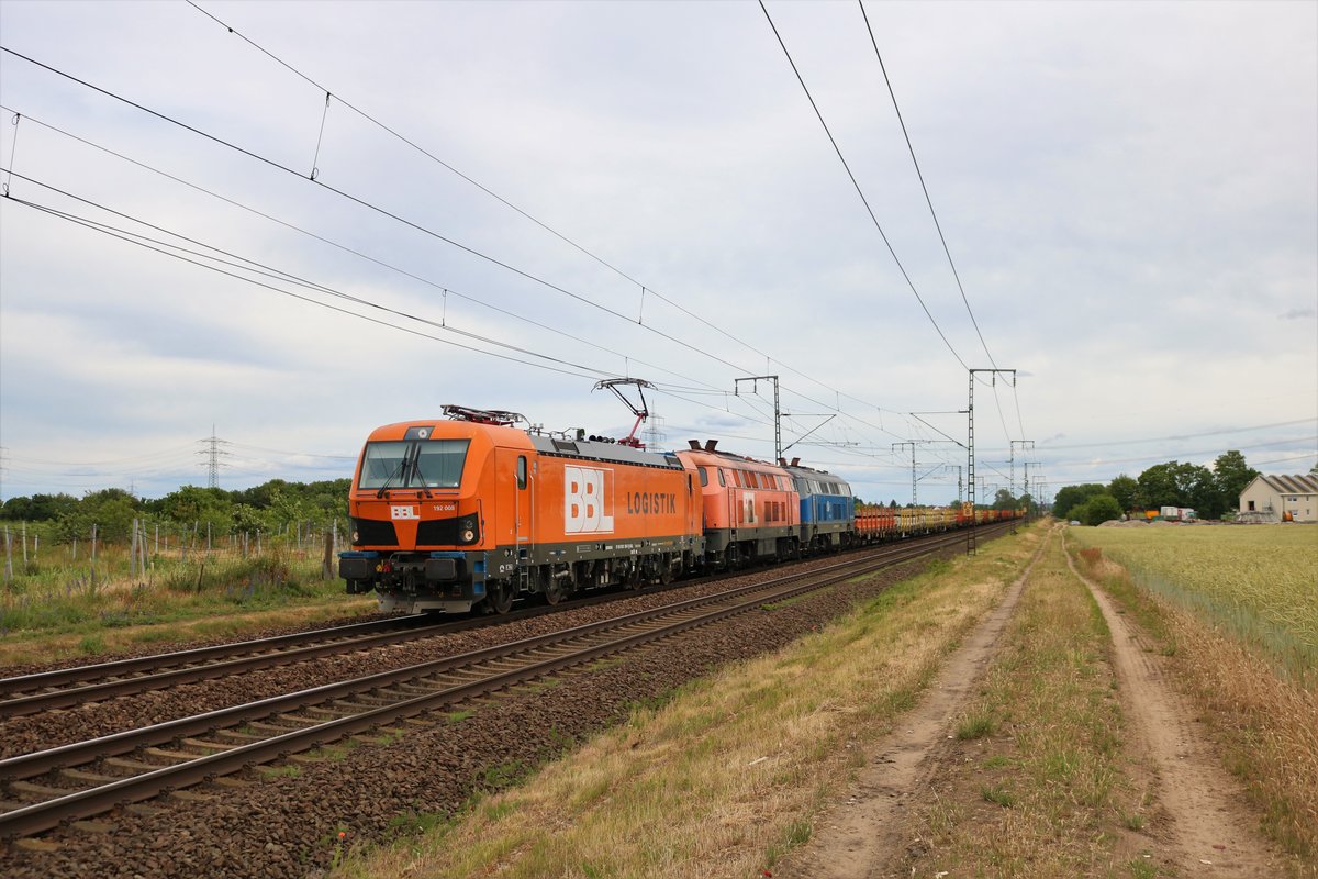 Mit einem Altschotterzug von der Gleisbaustelle der SFS Mannheim-Stuttgart fuhr am späten Nachmittag des 03.06.2020 die BBL 04 (214 001-0) zusammen mit der BBL 15 (214 026-7) nördlich von Waghäusel über die KBS 700 (Rheinbahn) in Richtung Mannheim. Tobias Schmidt