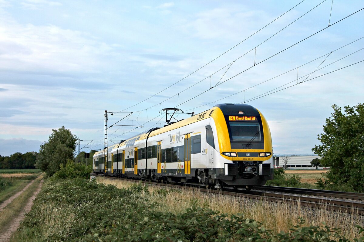 Als RE (Offenburg - Basel Bad Bf) fuhr am Abend des 08.07.2020 fuhr der Freiburger 1462 504-0 südlich von Buggingen durchs Rheintl in Riuchtung Müllheim (Baden), wo der nächste Zwischenhalt eingelegt wird. Tobias Schmidt