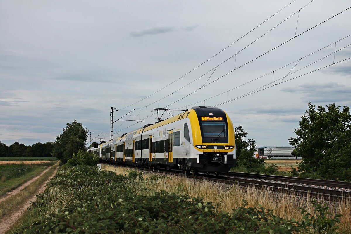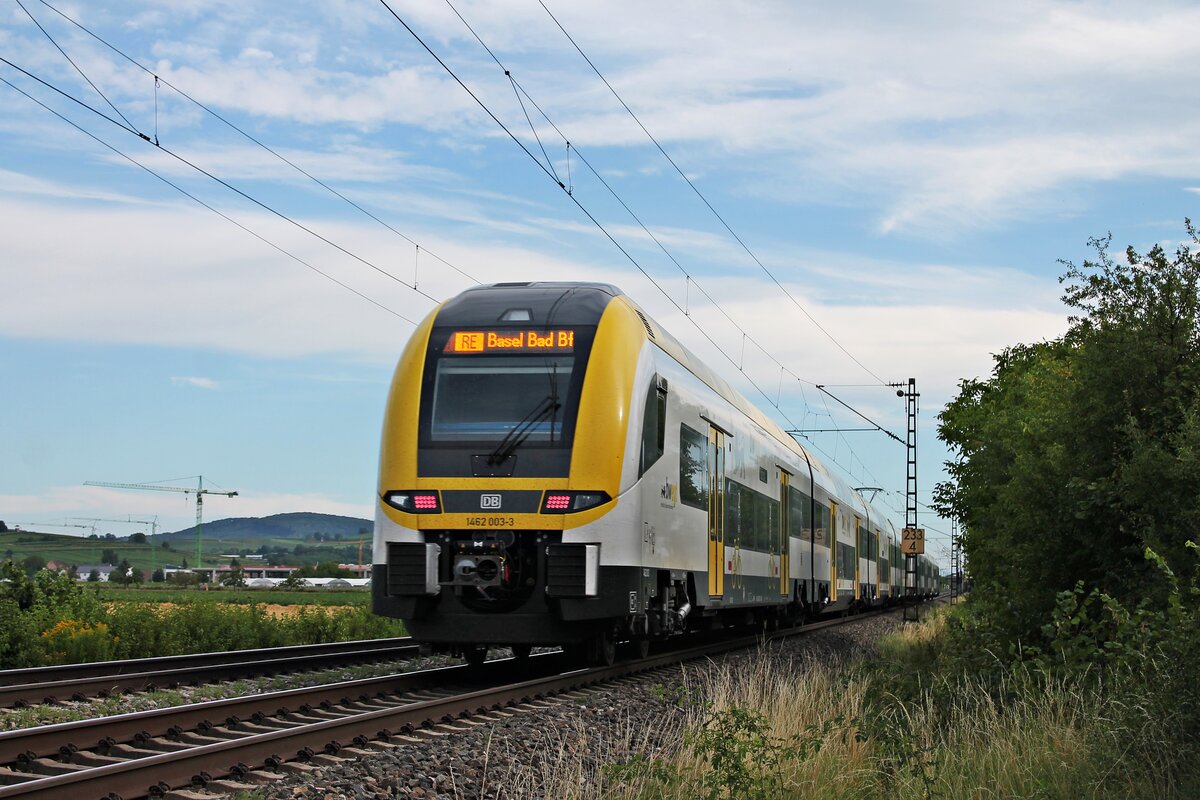Als RE (Basel Bad Bf - Offenburg) fuhr am Abend des 08.07.2020 der Freiburger 1462 512-3 zwischen Hügelheim und Buggingen über die Rheintalbahn in Richtung Freiburg (Breisgau). Tobias Schmidt