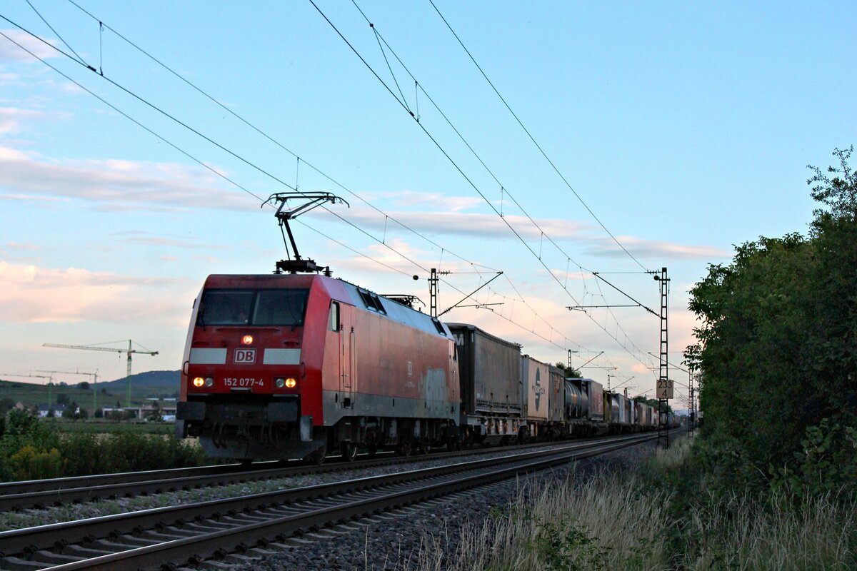 Am späten Abend des 08.07.2020 fuhr die 152 077-4 mit dem KT 42028 (Gallarate - Köln Eifeltor), welchen sie seit Basel SBB RB bespannte, nördlich von Hügelheim über die Rheintalbahn in Richtung Freiburg (Breisagau). Tobias Schmidt