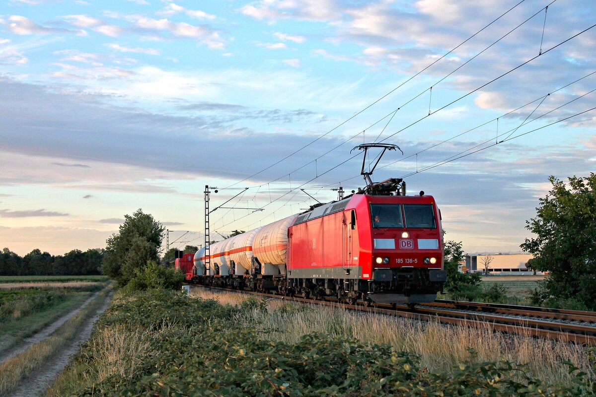 Im letzten Streiflicht am Abend des 08.07.2020 fuhr die 185 138-5 mit dem EZ 45027 (Mannheim Rbf - Chiasso Smistamento) südlich von Buggingen durchs Rheintal in Richtung Müllheim (Baden). Tobias Schmidt