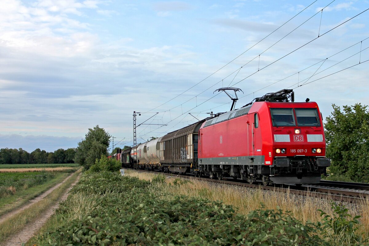 Mit dem EZ 44613 (Mannheim Rbf - Basel SBB RB) fuhr am Abend des 08.07.2020 die 185 097-3 südlich von Buggingen über die KBS 702 in Richtung Schweiz. Tobias Schmidt