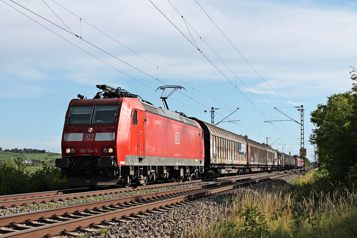 Mit dem leeren "Novelis"-Aluzug EZ 48610 (Basel SBB RB - Göttingen Gbf) fuhr am Abend des 08.07.2020 die 185 124-5 nördlich von Hügelheim über die KBS 702 (Rheintalbahn) in Richtung Buggingen. Tobias Schmidt