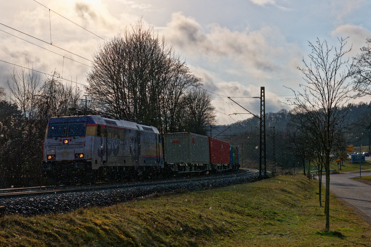 Kommt öfter anders als man denkt: Postiert hatte ich mich eigentlich an dieser Stelle, da ich bei der Bewölkung keinerlei Sonne erwartete. Für die präferierte 185 589 RHC "500 Jahre Reformation" setzte dann Schneefall ein und die Sonne kam raus. Ganz spontan wurden die Kameraeinstellungen angepasst. Nachdem die Lok den Containerzug nach Regensburg brachte sollte es in Regensburg Ost dann nochmal klappen mit 185 589. (Aufnahmedatum 19.03.2021) Korbinian Eckert
