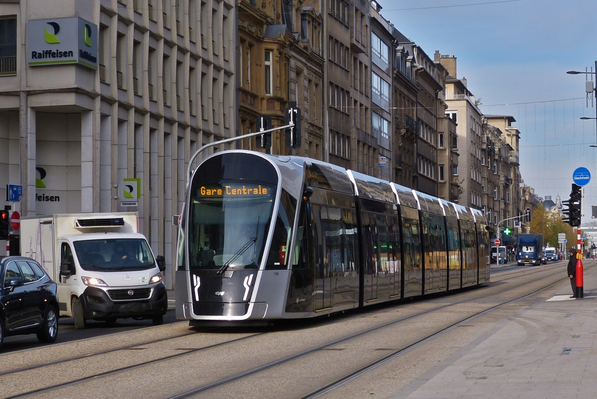 Aus der Oberstadt von Luxemburg nähert sich das Straßenbahnfahrzeug 125 der momentanen Endhaltestelle am Bahnhof von Luxemburg. 11.2021 De Rond Hans und Jeanny