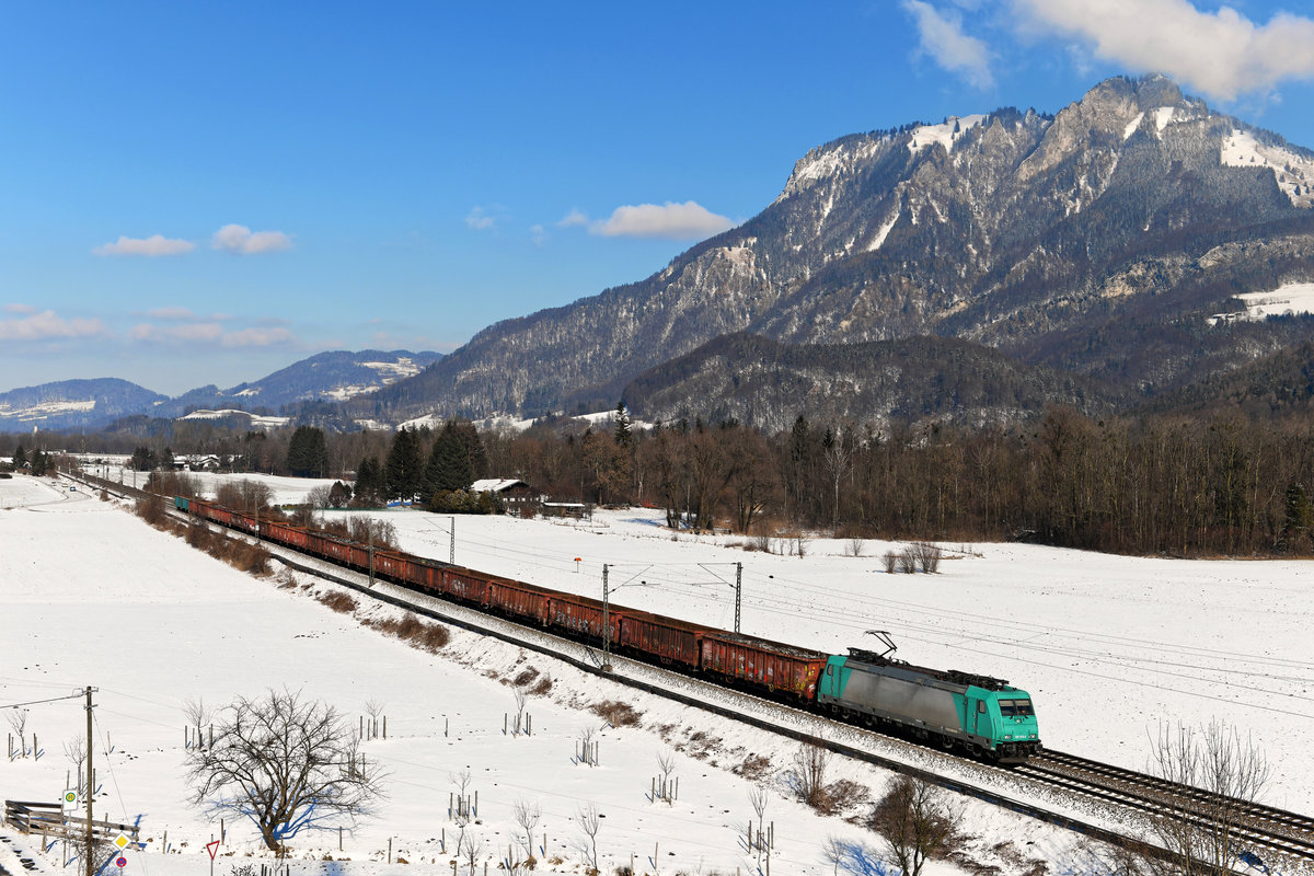 Schon lange wollte ich das bekannte Motiv bei Kirnstein mit verschneiter Landschaft umsetzen. Kein leichtes Unterfangen, denn im Dezember und Januar liegt die Stelle praktisch komplett im Schatten. Später gibt es dann ein kurzes Zeitfenster zwischen dem Zeitpunkt, ab dem die Sonne über die Gleisachse gewandert ist und bevor sie hinter den Bergen verschwindet. Am 12. Februar 2021 hat sich der Aufstieg gelohnt, auch wenn die Zugauswahl nicht spektakulär war. Die von Alpha Trains angemietete 185 576 brachte an diesem Tage den Lokomotion-Schrottzug DGS 43131 von München Nord nach Brescia in Norditalien und konnte mit dem Heuberg im Hintergrund dokumentiert werden. Christoph Schneider