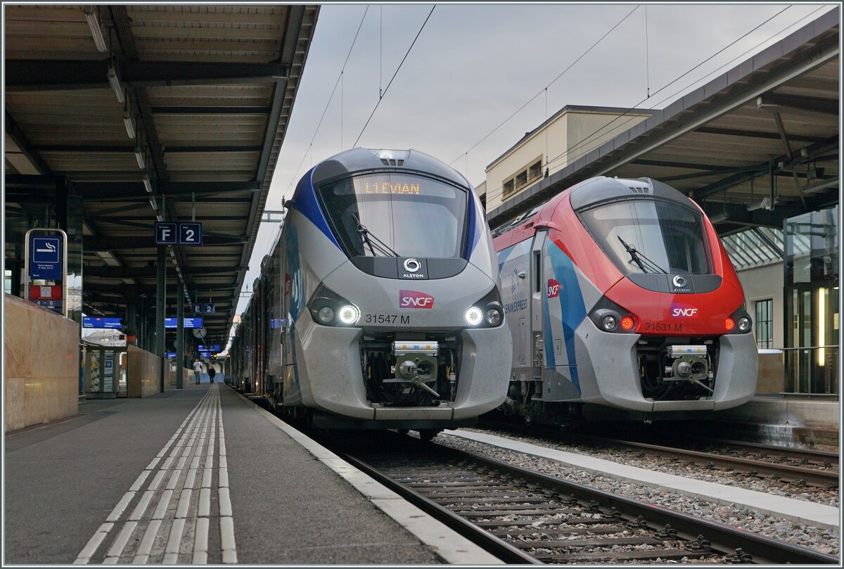 In Annemasse warten der SNCF Coradia Polyvalent régional tricourant Z 31535 nach Coppet und der Z 31 539 nach Evian als Léman Express Züge auf die Abfahrt.