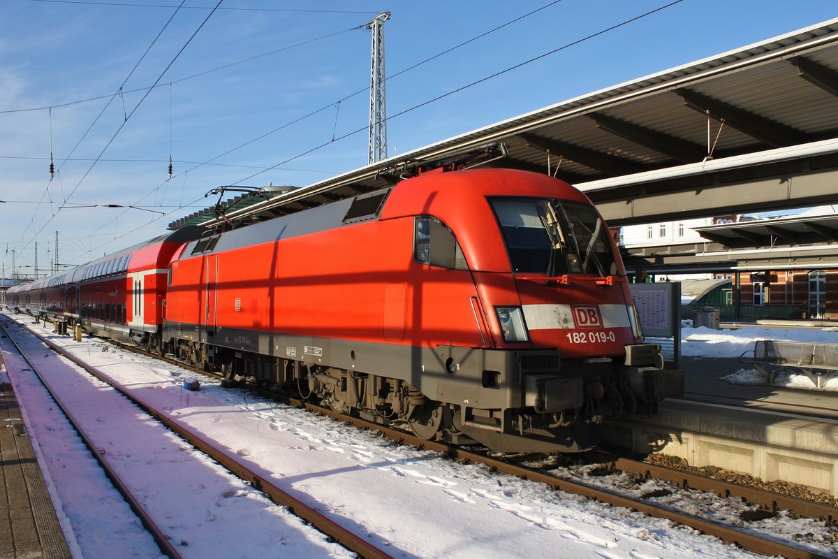 Noch bis zum Jahresende gehören die DB 182er mit Dostos zum gewohnten Bild des RE1. Dann übernimmt die ODEG diese Linie.