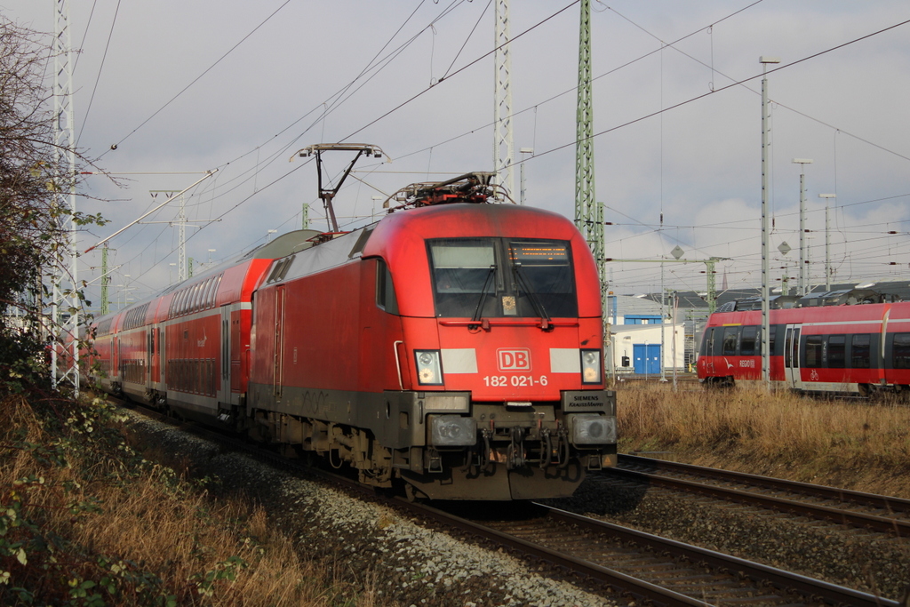 DB Regio Nordost mit dem RE1 nach Frankfurt/Oder mit "182 021-6" [NVR-Nummer: 91 80 6182 021-6 D-DB] am 16.12.21 in Berlin Hirschgarten nach Erkner. Lothar Stöckmann