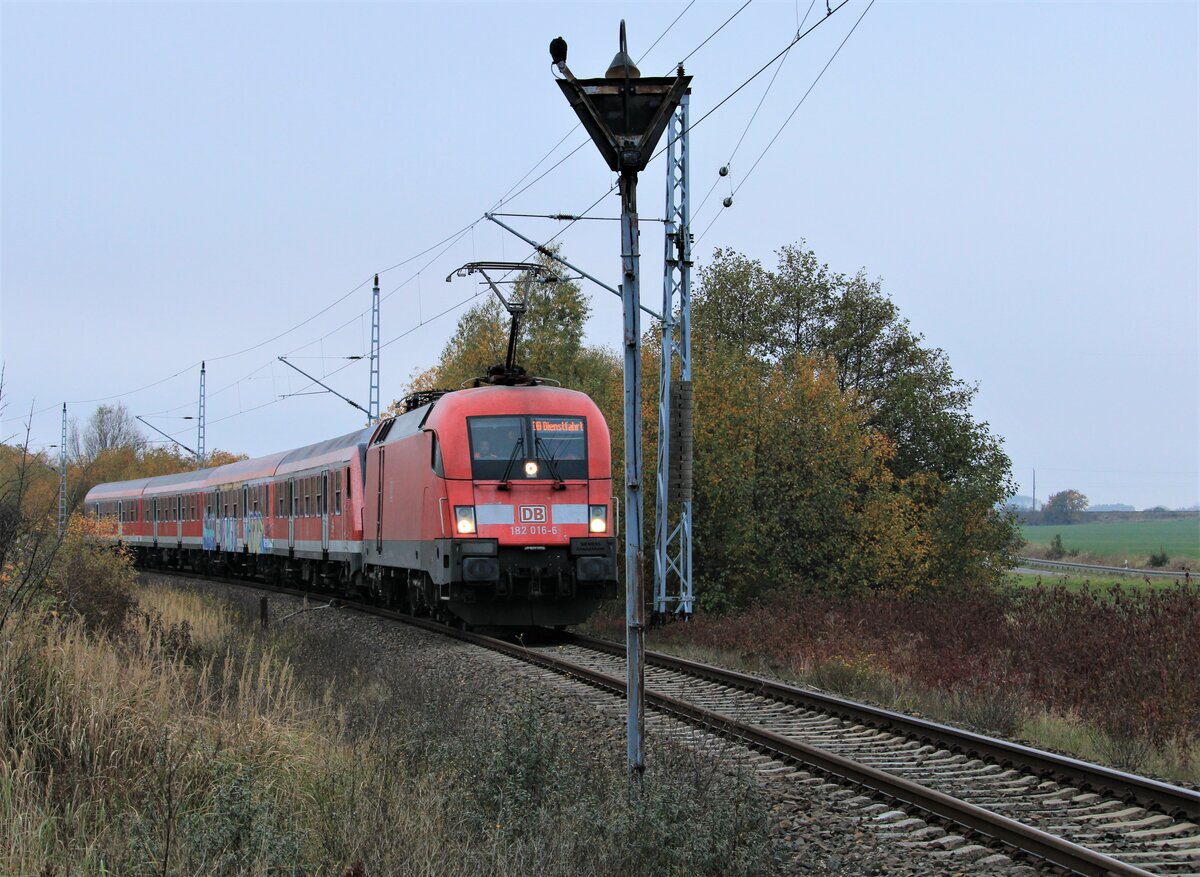 Taurus 182 018 fährt auf dem RE1 in Richtung Frankfurt/Oder und erreicht gerade den Bahnhof Berlin-Alexanderplatz. Sie hatte am Ende aufgrund des aktuell stattfindenden GDL-Streiks und des daraus resultierenden hohen Fahrgastaufkommens ca. 25 Minuten Verspätung. Züge in Thüringen