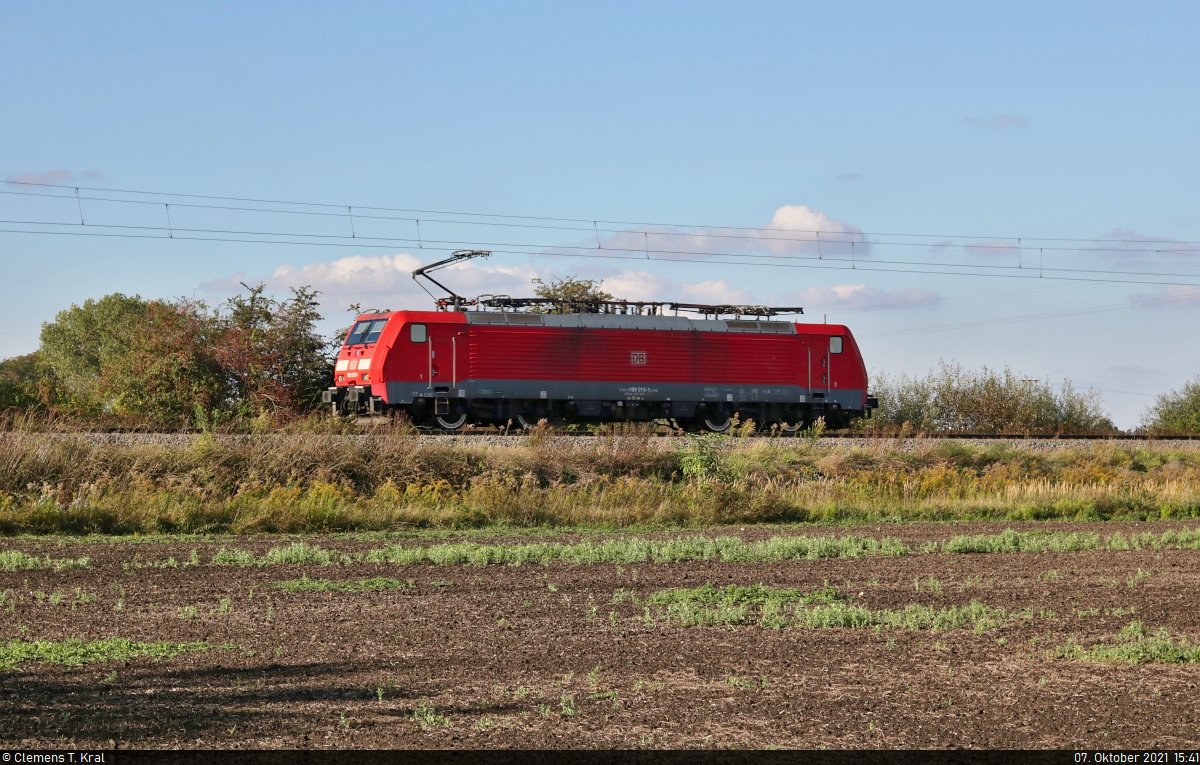 189 015-1 (Siemens ES64F4) als Tfzf bewegt sich östlich von Zöberitz auf Halle (Saale) zu.