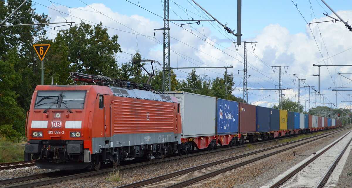 DB Cargo AG [D] mit "189 003-7" [NVR-Nummer: 91 80 6189 003-7 D-DB] und VW-Nutzfahrzeuge Transportzug am 18.10.21 Durchfahrt Bf. Golm (Potsdam). Lothar Stöckmann