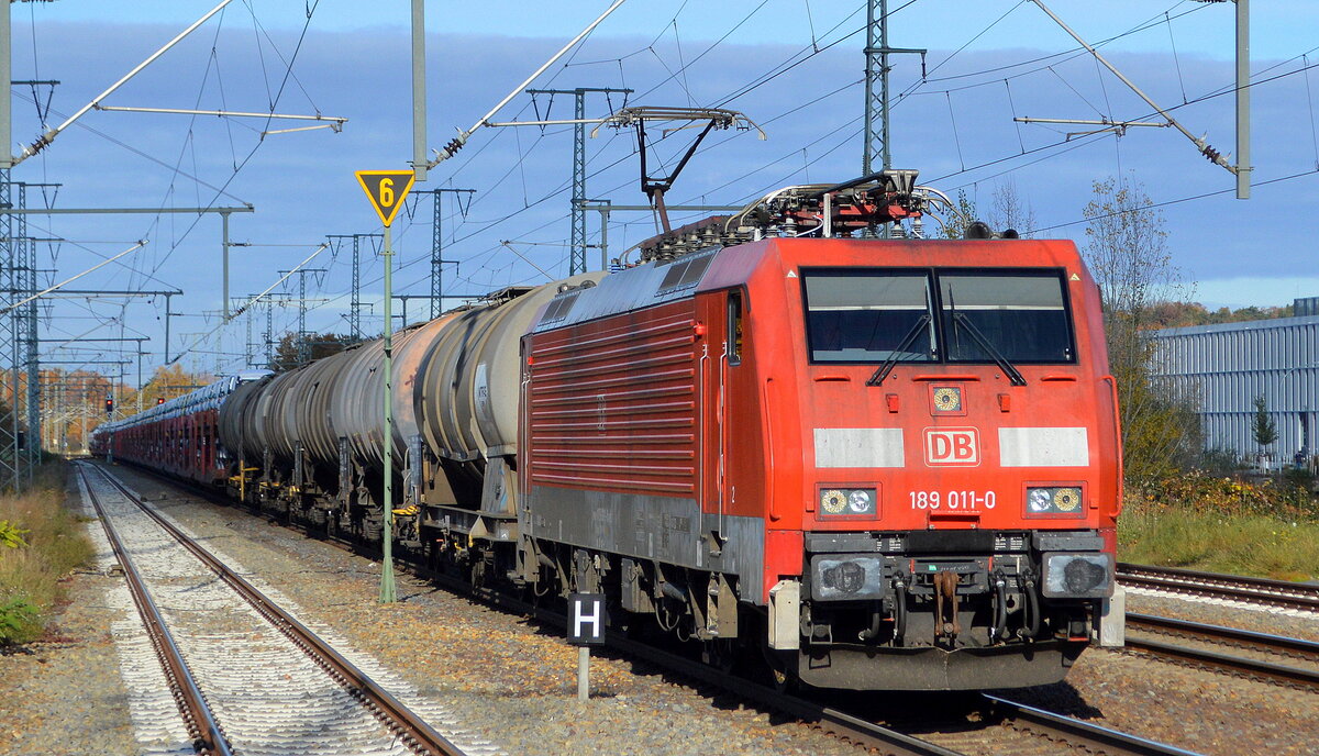 DB Cargo AG [D] mit "189 011-0" [NVR-Nummer: 91 80 6189 011-0 D-DB] und gemischtem Güterzug am 03.11.21 Durchfahrt Bf. Golm (Potsdam). Lothar Stöckmann