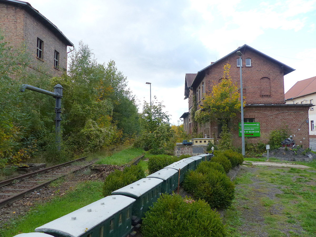 Der ehemalige Bahnhof Gerbstedtam an der Halle-Hestedter-Eisenbahn am 28.09.2019. Der Wasserkran ist noch vorhanden. Zudem kann man dort verschiedene und einzigartige 1:10 Modelle aus Stein bewundern. Frank Thomas