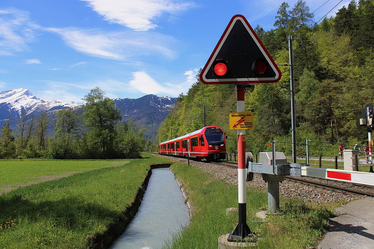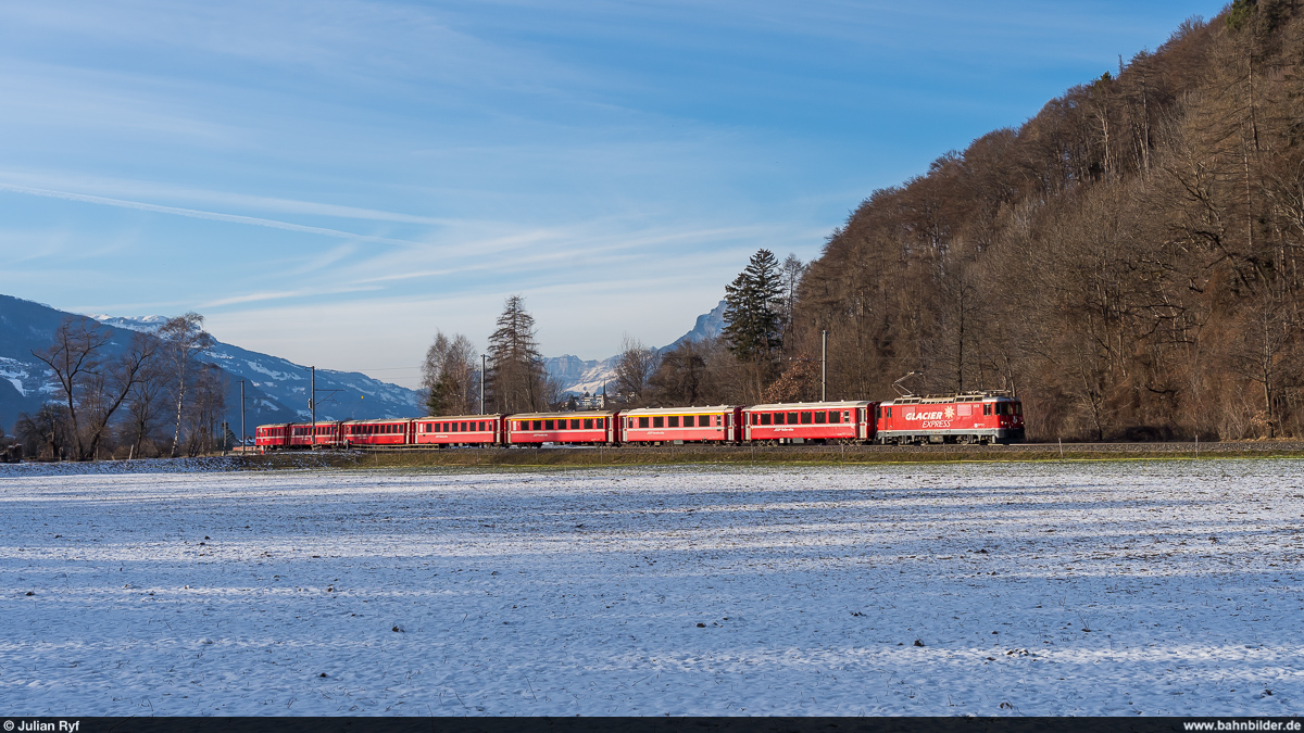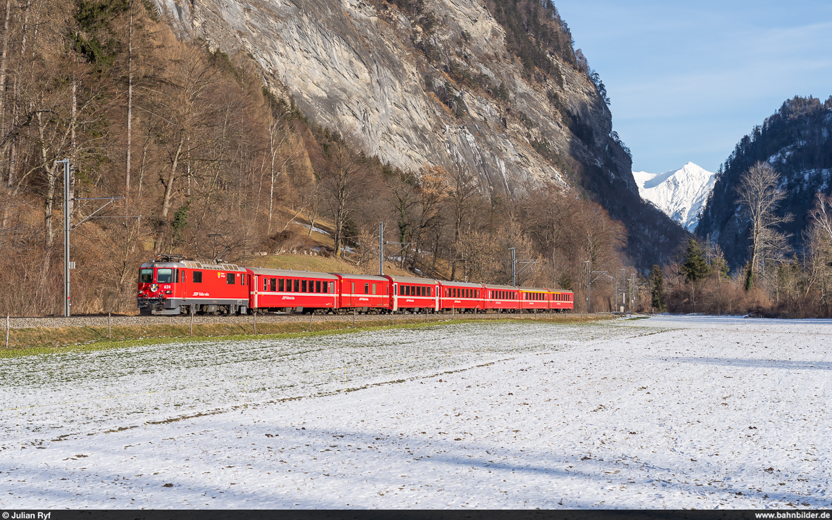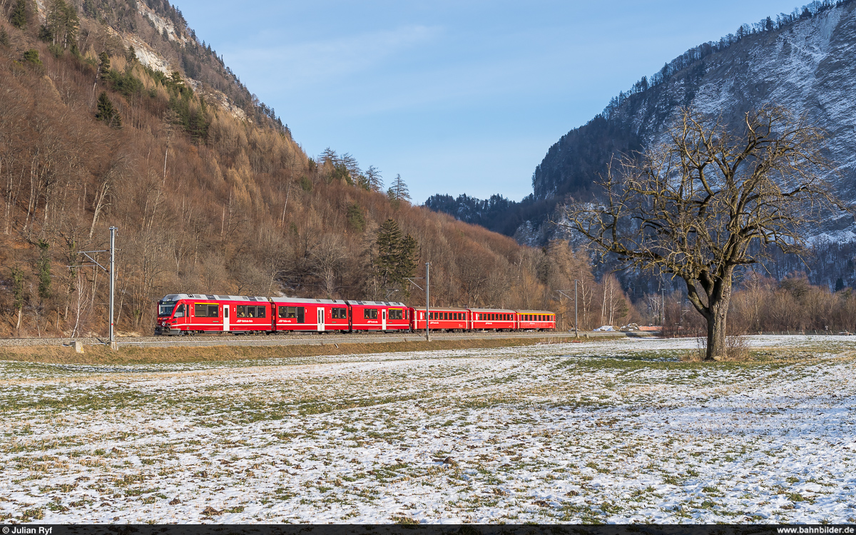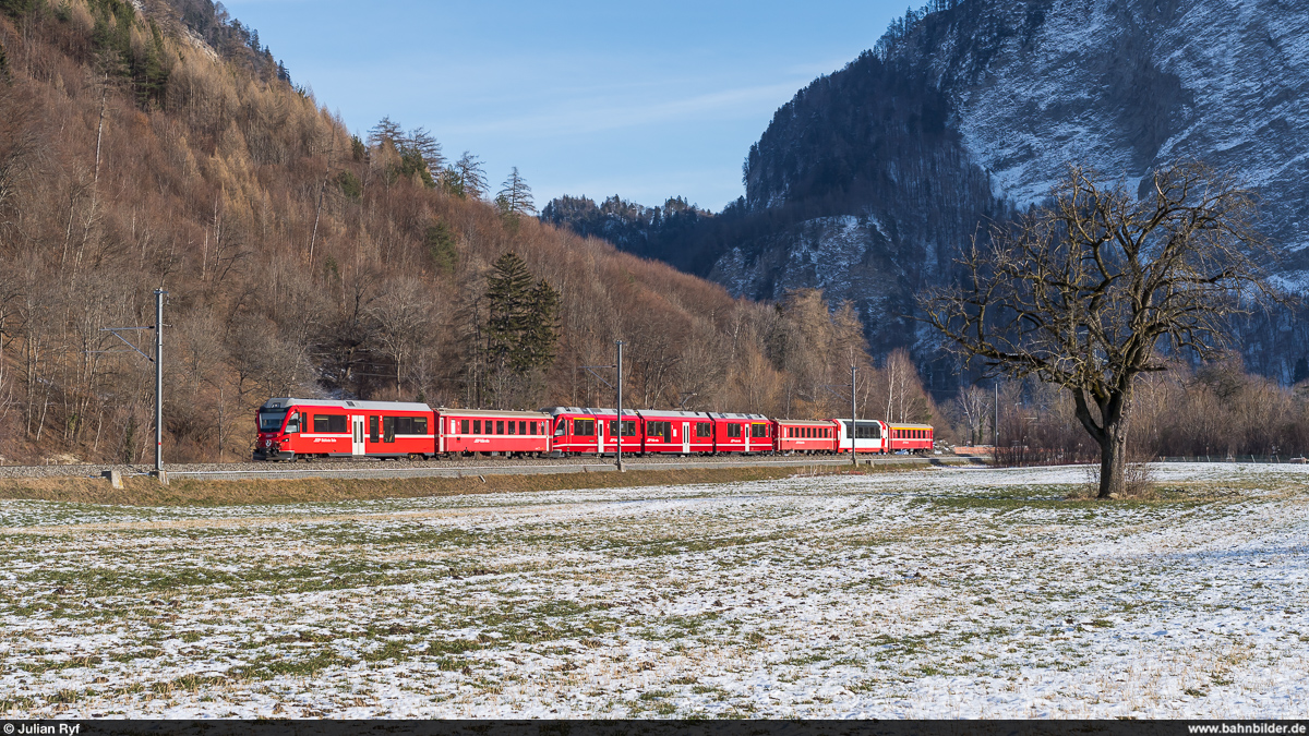 RhB Allegra ABe 8/12 mit einer für diese Linie sehr ungewöhnlichen Komposition als RE Davos - Landquart am 9. Januar 2021 bei Malans. Der gehobene hintere Stromabnehmer des Allegra ist eigentlich für die mit Gleichstrom elektrifizierte Berninastrecke gedacht. Der Wechselstrompantograph befindet sich auf dem Mittelwagen. Julian Ryf