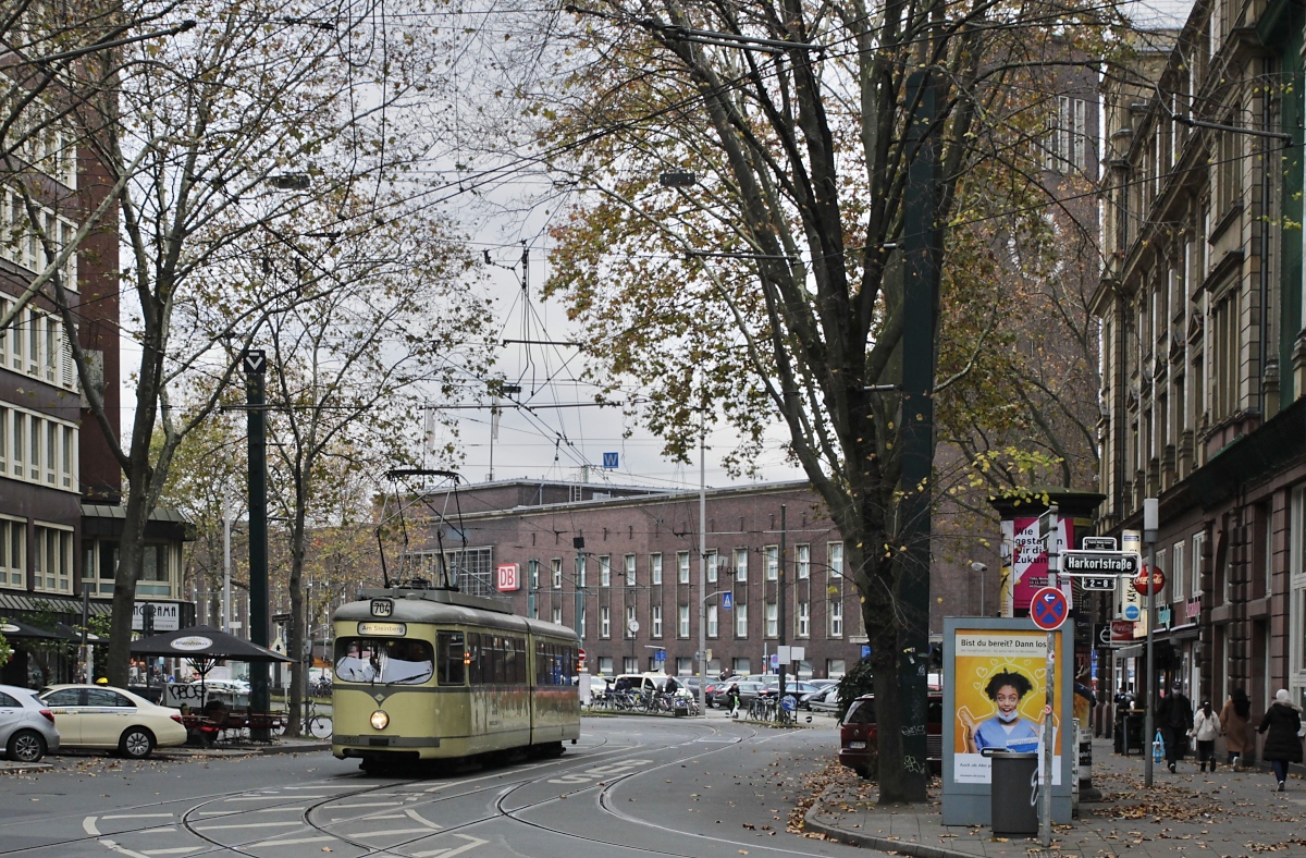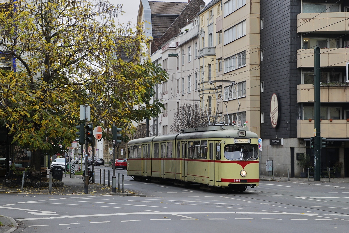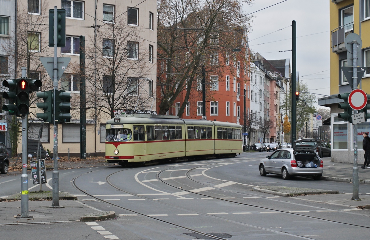 Am 14.11.2021 war die Ausstellung "125 Jahre Rheinbahn" im ehemaligen Straßenbahndepot Am Steinberg zum letzten Mal in diesem Jahr geöffnet. Aus diesem Anlass verkehrten 4 historische Triebwagen als kostenlose Zubringer zwischen dem Düsseldorfer Hauptbahnhof und dem Depot. Vierter im Bunde der historischen Fahrzeuge war der GT8 2965, hier an der Kreuzung Helmholzstraße/Scheurenstraße/Hüttenstraße. Horst Lüdicke