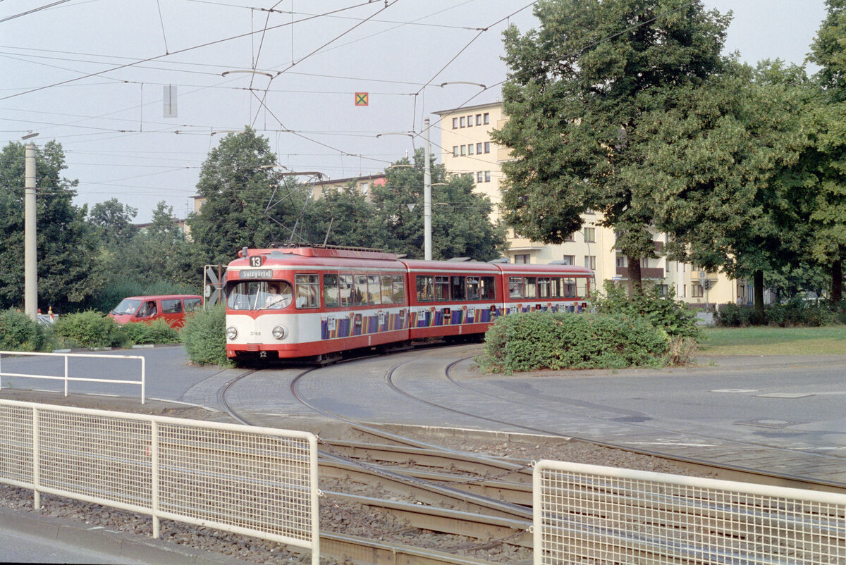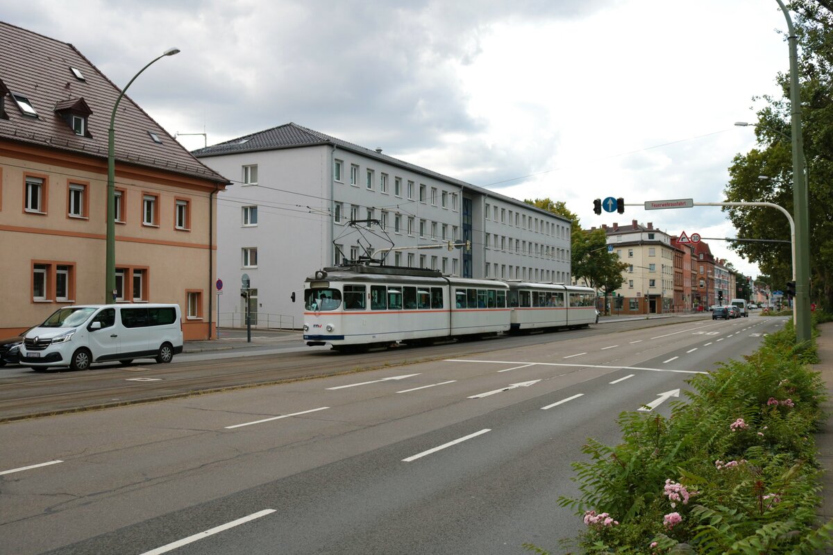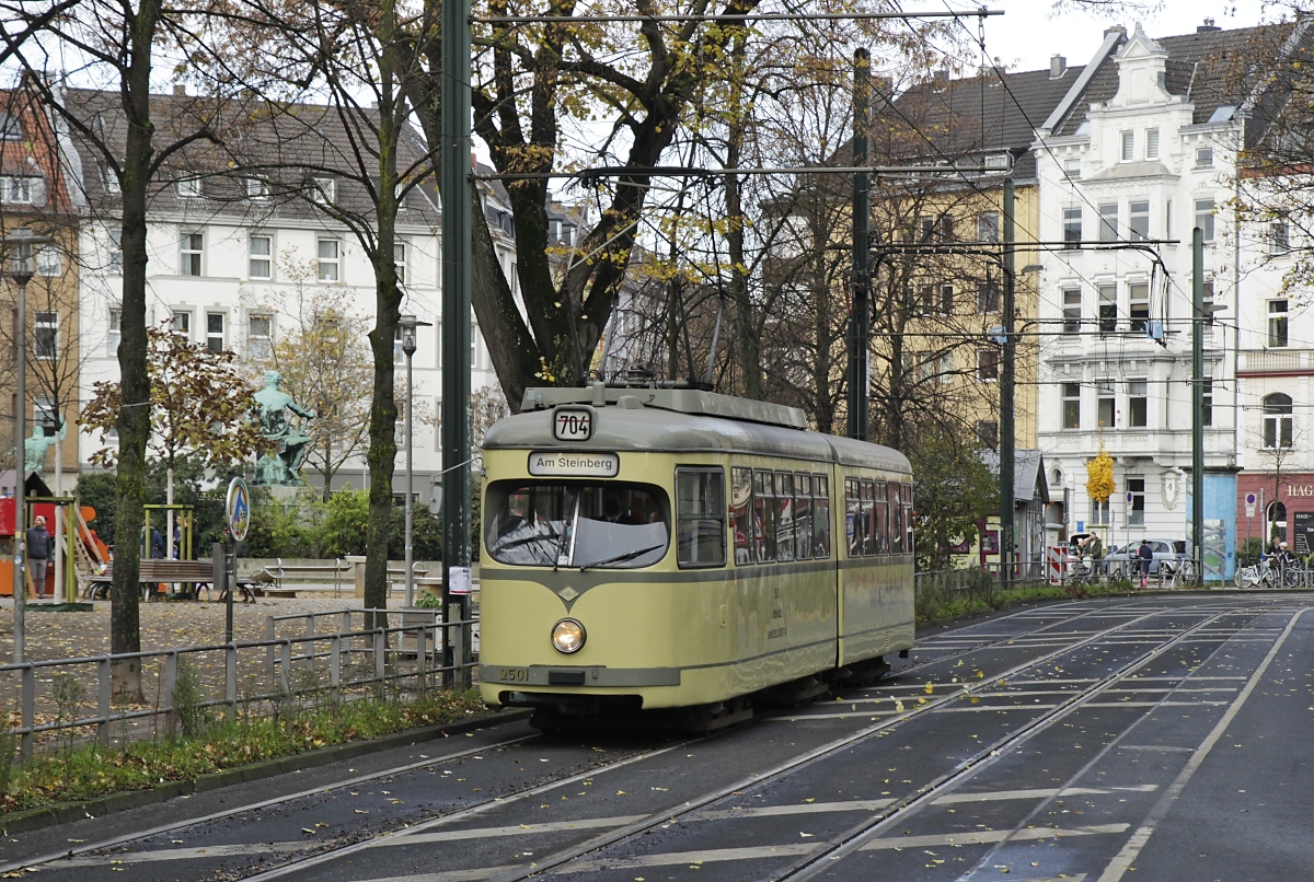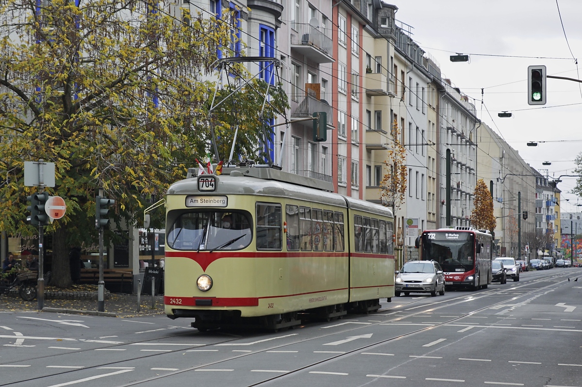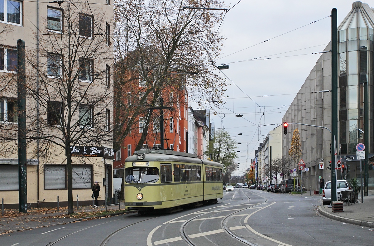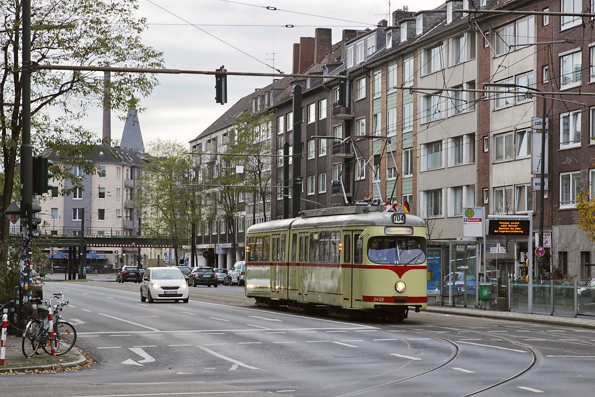 Am 14.11.2021 war die Ausstellung "125 Jahre Rheinbahn" im ehemaligen Straßenbahndepot Am Steinberg zum letzten Mal in diesem Jahr geöffnet. Aus diesem Anlass verkehrten 4 historische Triebwagen als kostenlose Zubringer zwischen dem Düsseldorfer Hauptbahnhof und dem Depot. Als weiteres historisches Fahrzeug wurde der 100. an die Rheinbahn abgelieferte Gelenkwagen, der GT6 2432, eingesetzt, der hier die Kreuzung Helmholzstraße/Scheurenstraße/Hüttenstraße überquert. Horst Lüdicke