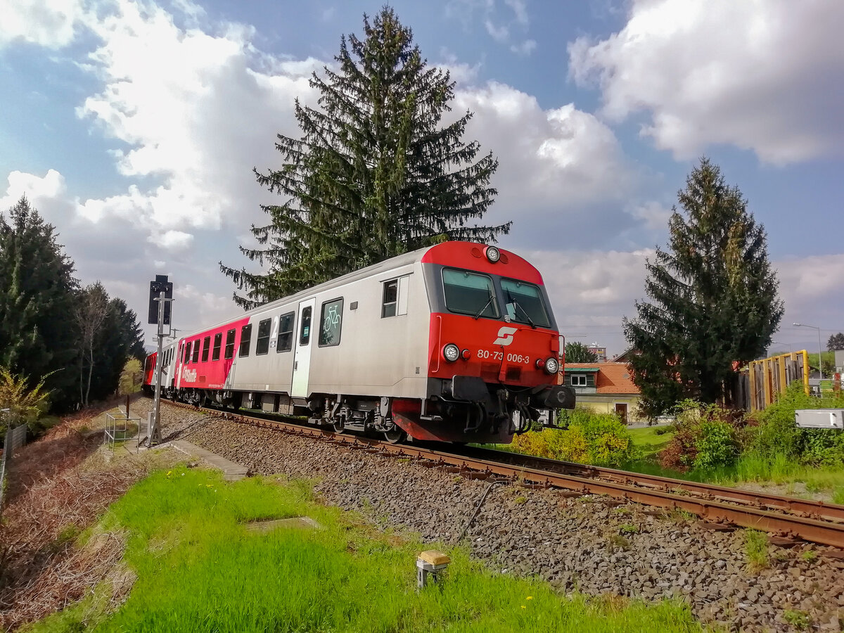 Graz. Eine Cityshuttle Wendezuggarnitur mit dem Steuerwagen 8073 025 an der Spitze, fuhr am 01.04.2021 als S3 von Graz nach Fehring, hier im Bahnhof Graz Ostbahnhof-Messe. Armin Ademovic