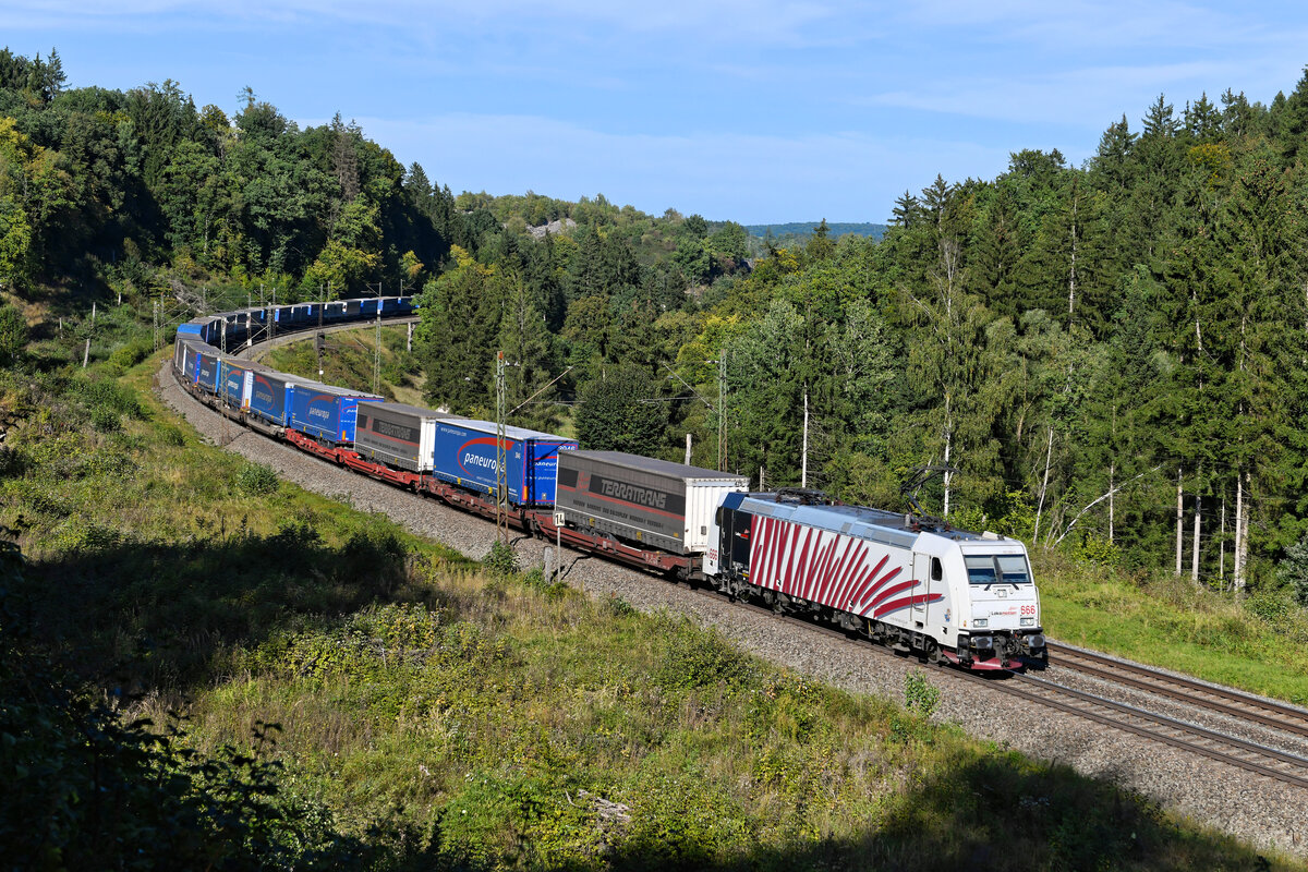 Mit dem DGS 43827 von Bremen Roland nach Verona Interterminal war am 23. September 2021 die 185 666 unterwegs und konnte von mir im Waldstück bei Gundelsheim fotografiert werden, Aufgrund ihrer Loknummer wird die Traxx-Maschine auch scherzhaft "Teufelszebra" genannt. Christoph Schneider