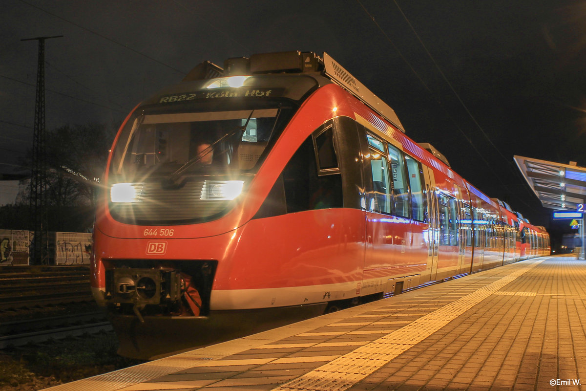 644 506 ist einer von sieben Fahrzeugen der Baureihe 644 die aus Ulm nach NRW kamen um hier auf den Linien RE 12,RB 22 und RB 23 aushilfsweise in Dreifachtraktion die Fahrzeuge der Baureihe 620 zu unterstützen. Ebendieser 644 506 Dieseltriebwagen war hier am 12.01.2021 auf der RB 22 unterwegs und konnte hier bei seiner Standzeit in Köln West langzeitbelichtet werden. wendezugsteuerung