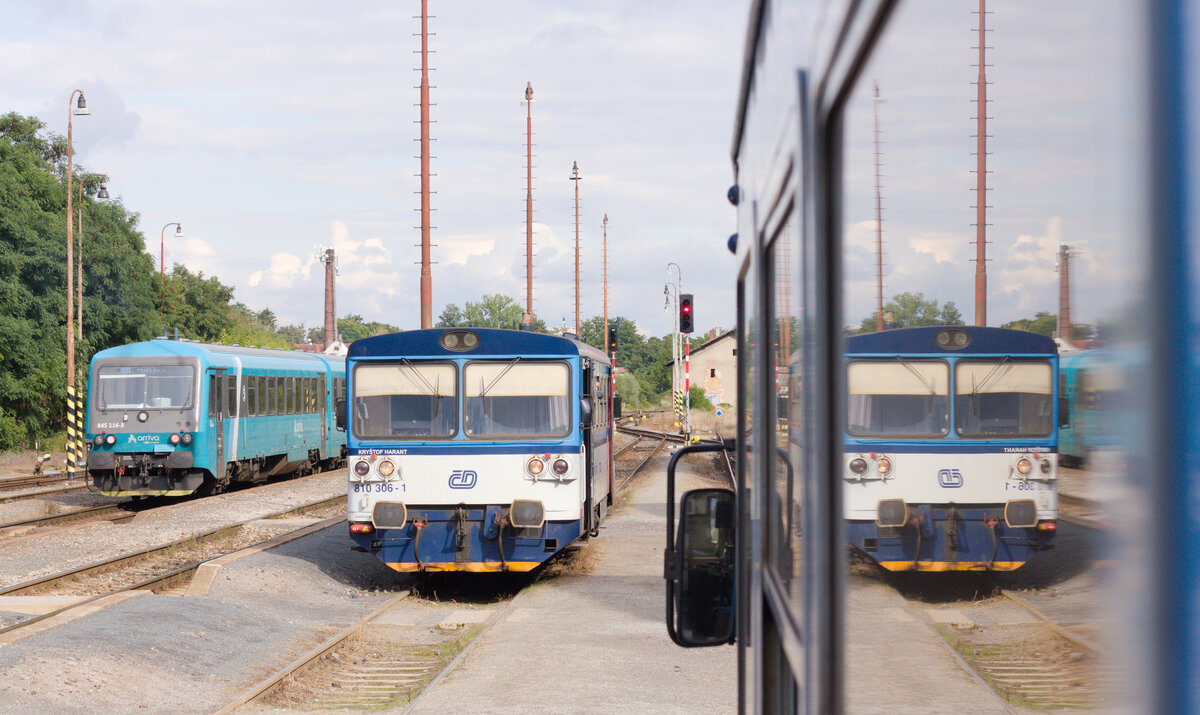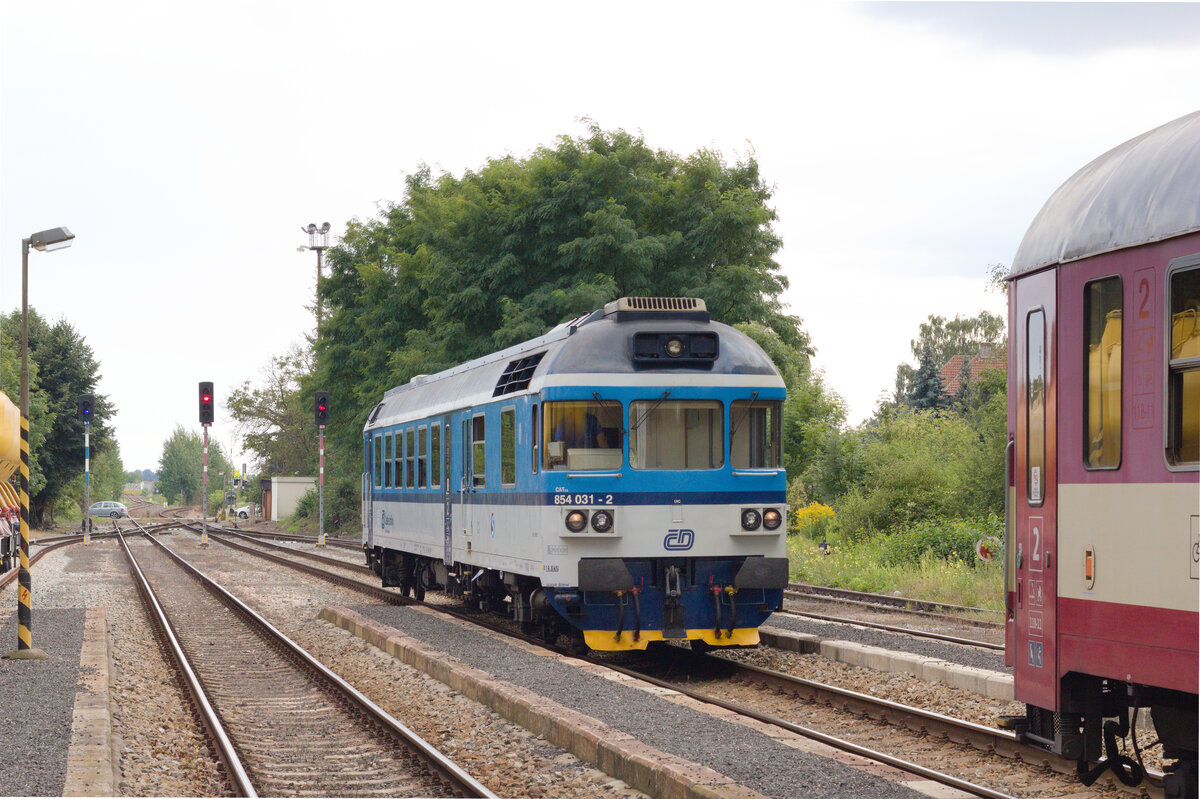 Am 27.08.2021 erreicht von 854 223 angeführter Regionalzug aus Prag den Bahnhof Hostivice. Rechts im Bild zeigt sich 810 306. Der Standort befand sich auf dem Bahnsteig.