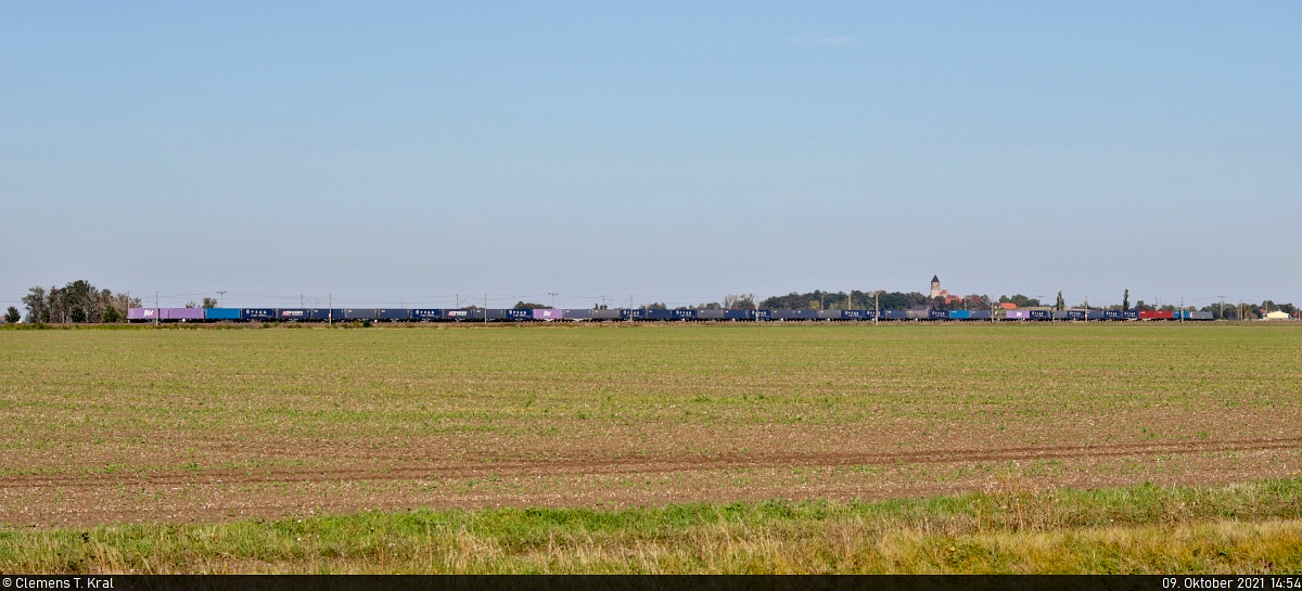 Ein Containerzug mit einer unbekannten 186 rollt bei Peißen Richtung Bitterfeld. Im Hintergrund erhebt sich das Schloss Hohenthurm.