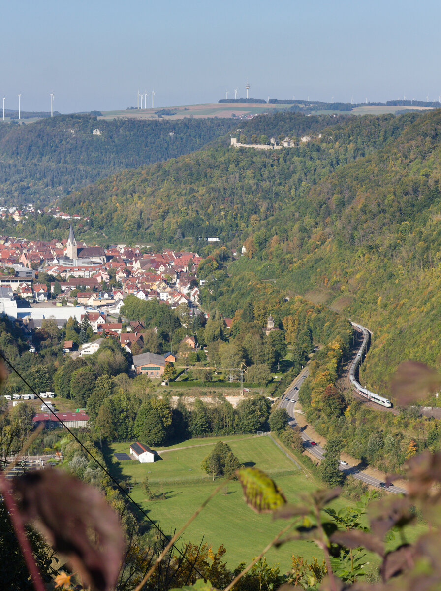 Ein ICE-4 aus München kommend auf der hier viergleisigen Filsbahn zwischen Esslingen und Mettingen.