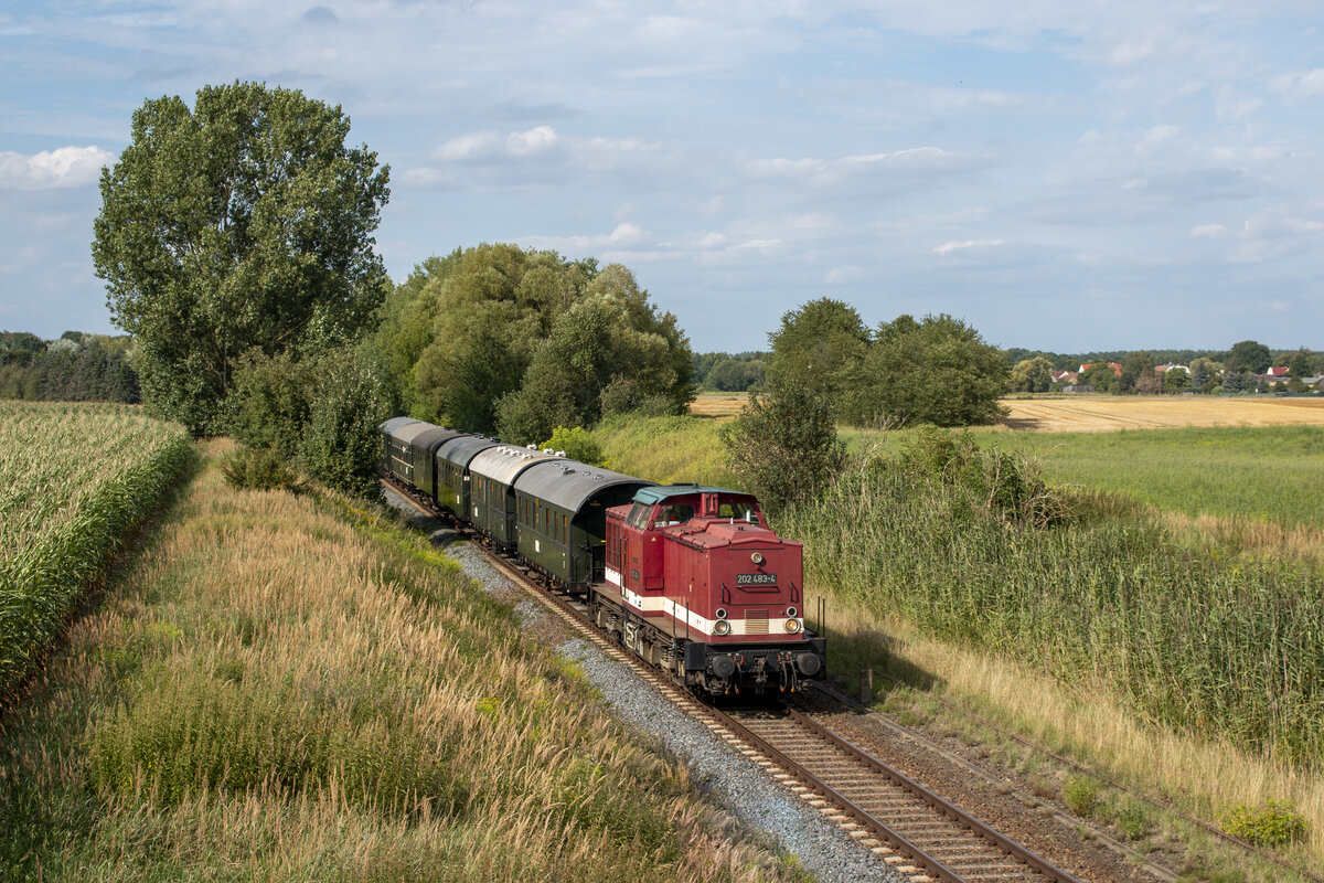 WFL 202 483 mit einem Sonderzug der Berliner Eisenbahnfreunde zuckelt die Heidekrautbahn entlang und erreicht in wenigen Augenblicken den Bahnhof Schönerlinde. Florian Heyn