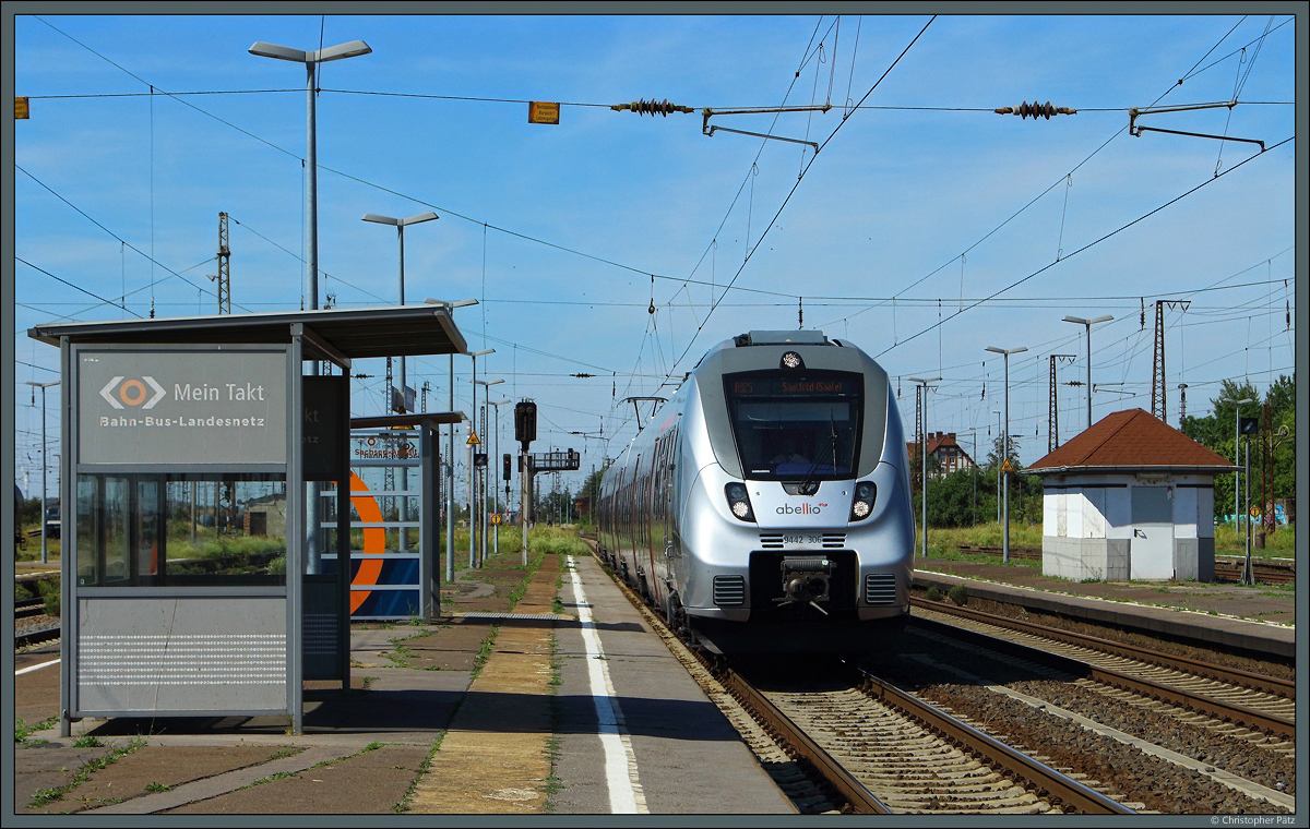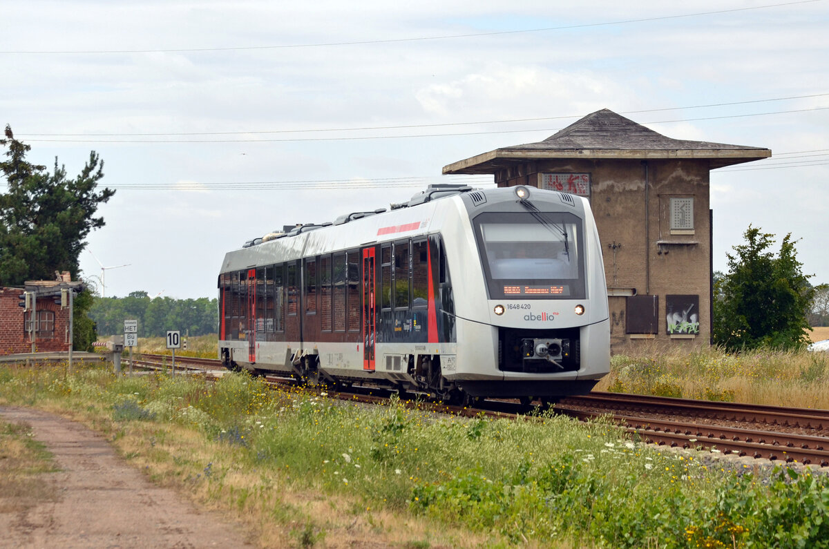 9442 306 der ABRM fährt am 24.07.2022 als RB 25 in Großkorbetha ein und passiert dabei Wetterschutzhäuser in neuem und altem Mein-Takt-Design. Rechts ist ein ehemaliges Aufsichtsgebäude zu sehen. Christopher Pätz