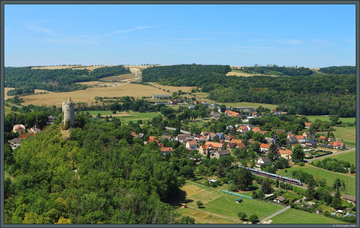 Vorbei am alten Stellwerk Cn verlässt 9442 315 von Abellio am 06.08.2022 den Bahnhof Camburg. Im Hintergrund ist die Camburg zu sehen. Christopher Pätz