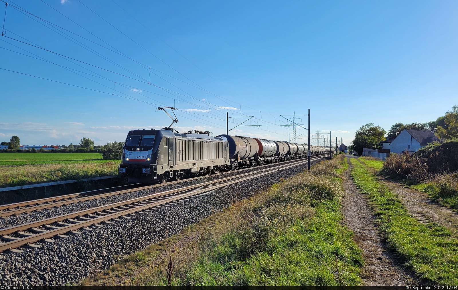 187 102-9 schleppt Kesselwagen durch Braschwitz Richtung Köthen.