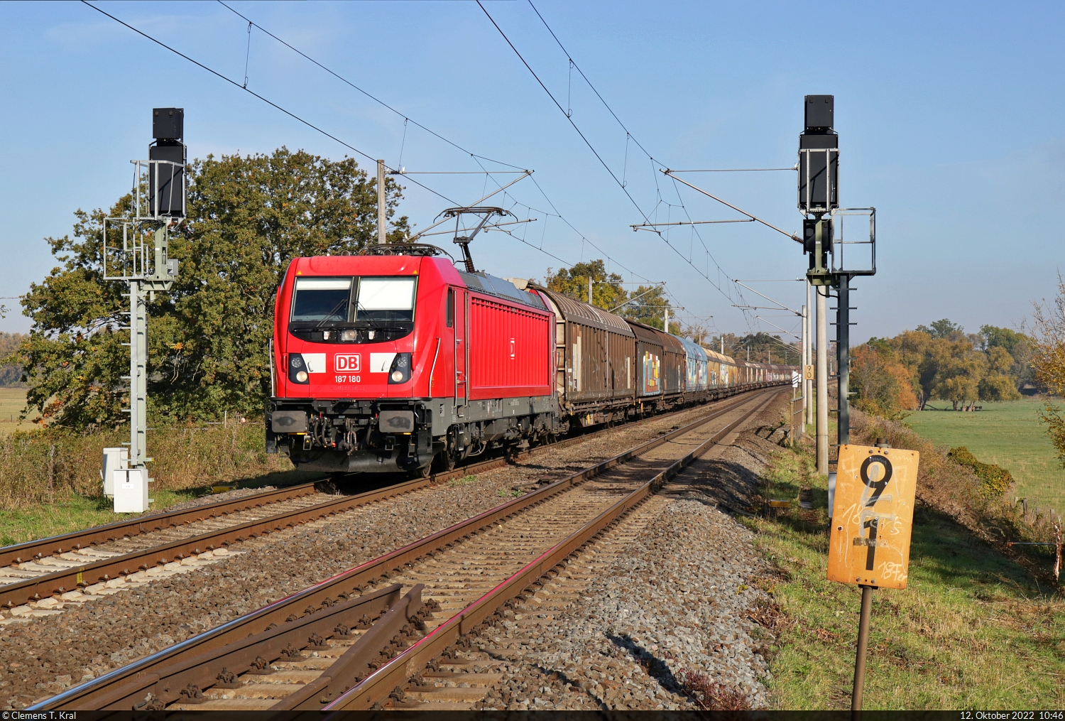 Die Baureihe 187 wurde zum Aufnahmezeitpunkt gerne vor gemischten Güterzügen zwischen München Nord und Nürnberg Rangierbahnhof eingesetzt. Am 22. September 2022 machte sich beispielsweise 187 183 in einem solchen Dienst nützlich. Eine Aufnahme davon entstand bei Breitenfurt im Altmühltal. Christoph Schneider