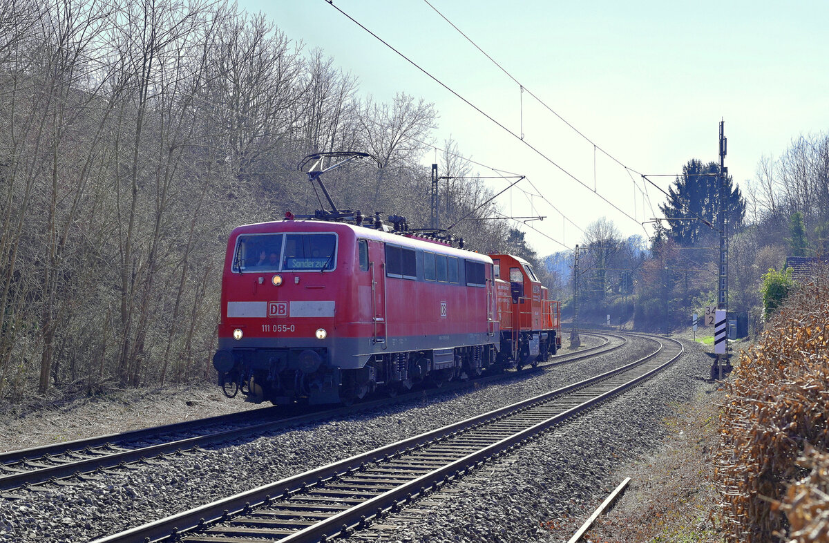Nachschuß auf den "Sonderzug" den die 111 055 am Mittag durch Neckargerach gen Zwingenberg Neckar in Form der 1002 018 überführte. 28.2.2022 Andreas Strobel