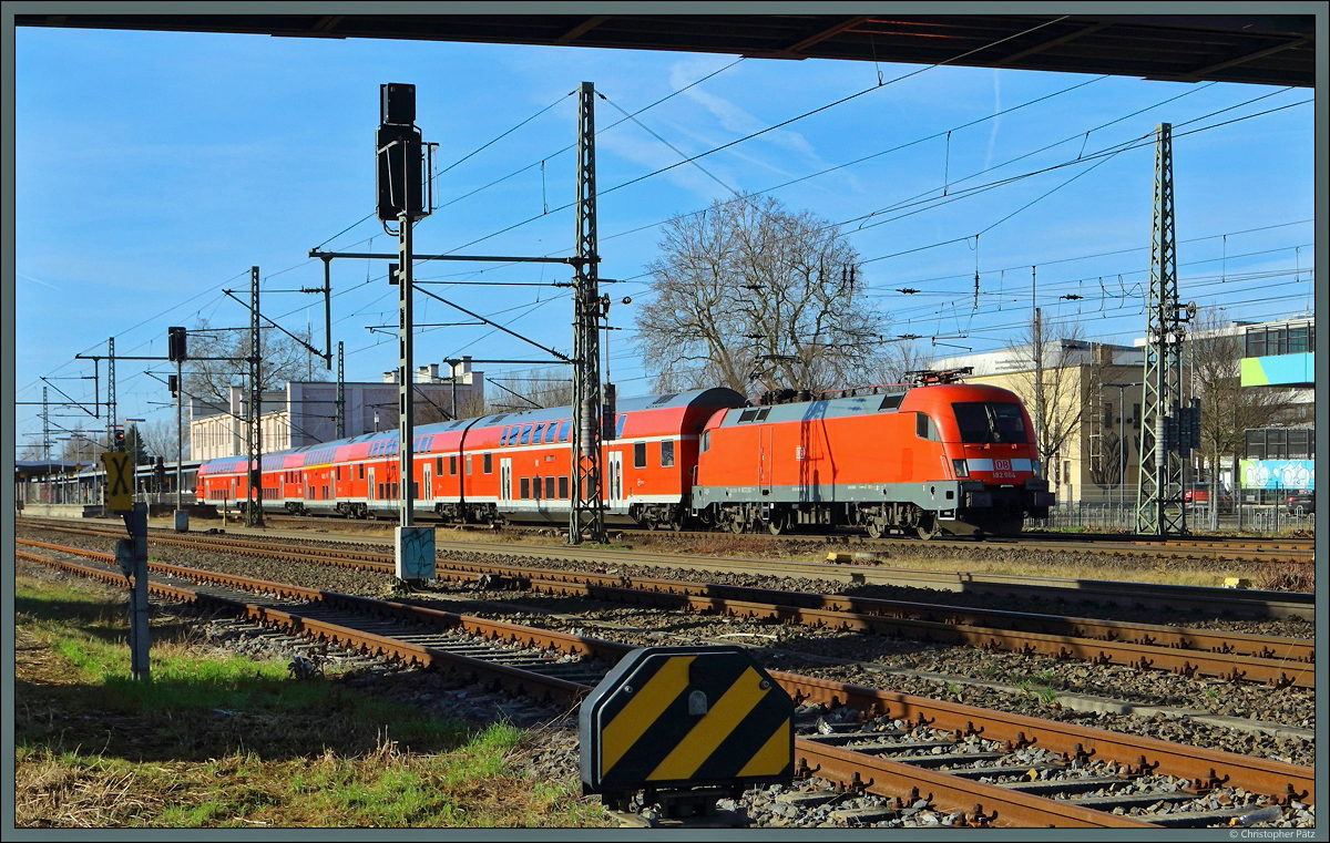 DB Regio AG - Region Nordost mit "182 016" [NVR-Nummer: 91 80 6182 016-6 D-DB] und dem RE1 nach Eisenhüttenstadt (heute bedingt durch Baustellen aus Berlin Lichtenberg kommend) am 21.03.22 Berlin Hirschgarten. Lothar Stöckmann