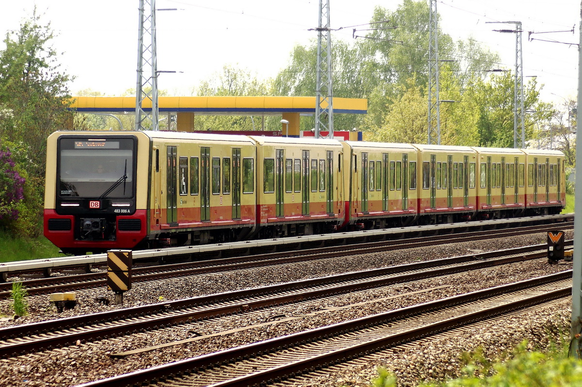 Berliner S-Bahn mit der Linie S45 als Halbzug 483 006 A (BR 483) in Richtung Südkreuz am 05. Mai 2022 bei der Einfahrt in Bahnhof Flughafen BER Terminal 5. Klaus-P. Dietrich