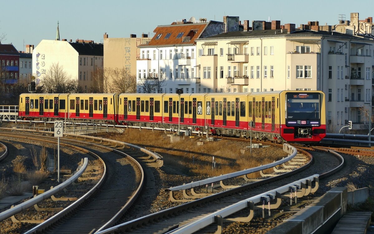 S45 der S-Bahn Berlin, hier mit der 484 011, kurz vor Erreichen der Station Südkreuz, mit Fahrtziel Flughafen BER Terminal 1-2. Berlin S-Südkreuz im Dezember 2022. Lugi