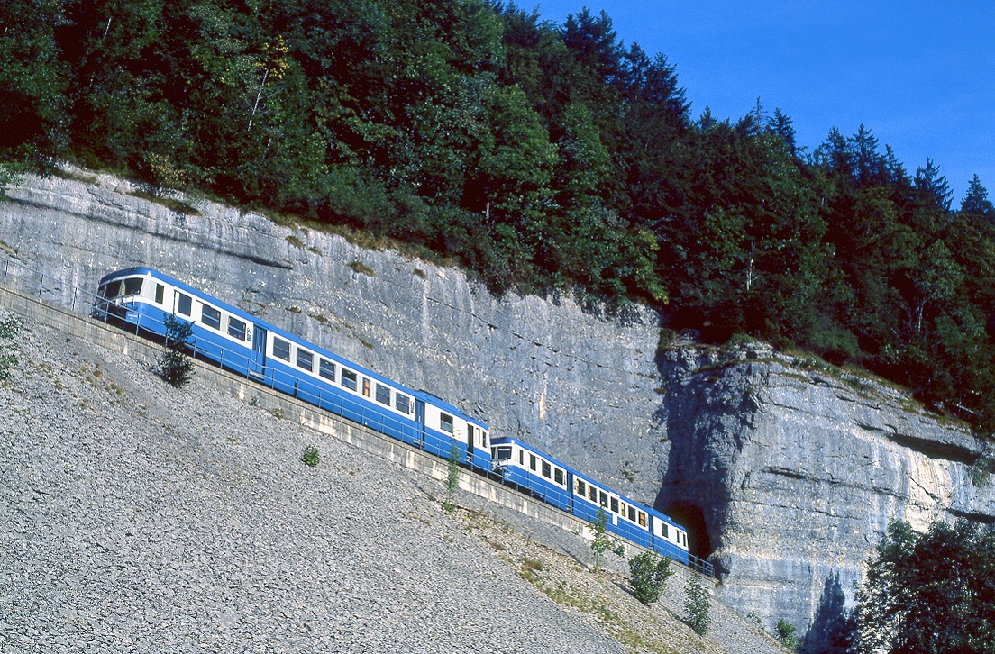Der (ex) SNCF X ABD 2816 ist im Rahmen einer Ostersonderfahrt beim den kleinen Weiler Pont de la Roche unterwegs. Der Dieseltriebwagen gehört der "Assosiation l'autrail X2800 du Haut Doubs". Der mitgeführte aber wenig passende Beiwagen wurde für dieses Foto "entfernt". Die Die schöne Strecke beginnt in Besançon, welches am Doubs liegt, auf 218 müM, führt quer durchs Land, erreicht kurz nach Gilly den noch jungen Doubs und in Le Locle mit 946 müM den Kulminationspunkt.