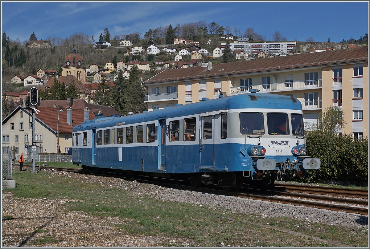 Der "Assosiation l'autrail X2800 du Haut Doubs" X 2816 mit Beiwagen erreicht im Rahmen einer Ostersonderfahrt in Kürze sein Ziel Morteau. Im Hintergrund ist die Kirche Notre-Dame de l'Assomptions zu sehnen.