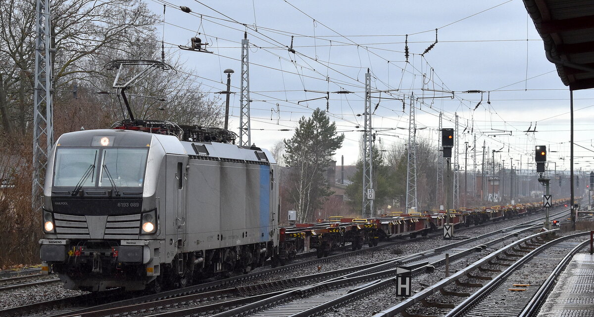 METRANS Rail s.r.o., Praha [CZ] mit der Railpool Vectron "6193 089" (NVR-Nummer: 91 80 6193 089-0 D-Rpool] und einem Ganzzug Containertragwagen (leer) Richtung Frankfurt/Oder nach Polen am 29.12.22 Berlin Hirschgarten. Lothar Stöckmann